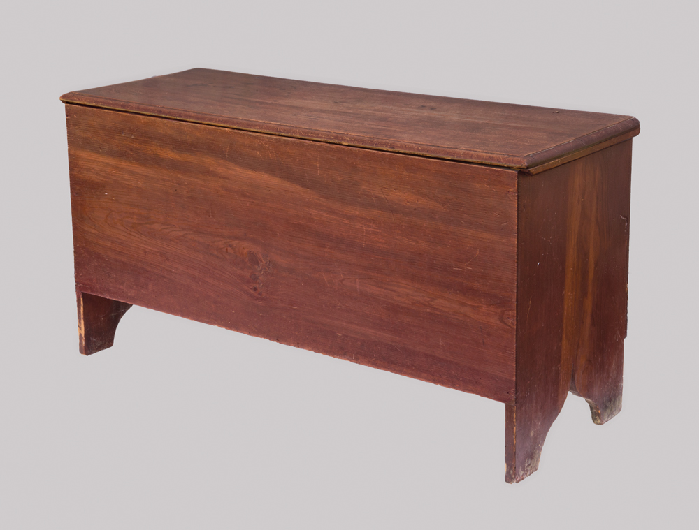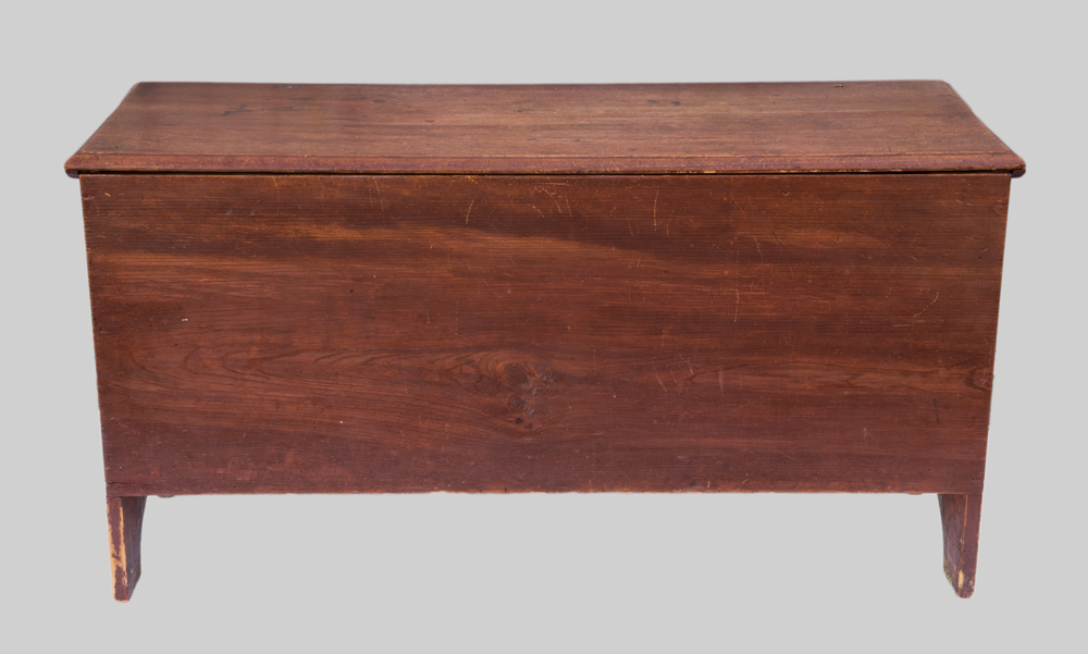 New England, pine, original red painted finish, snipe hinges, bootjack ends, removable dovetailed till box, with hidden three-section bottle box underneath, 23 1/2″ h, 43 1/2″ w, 17″ d.