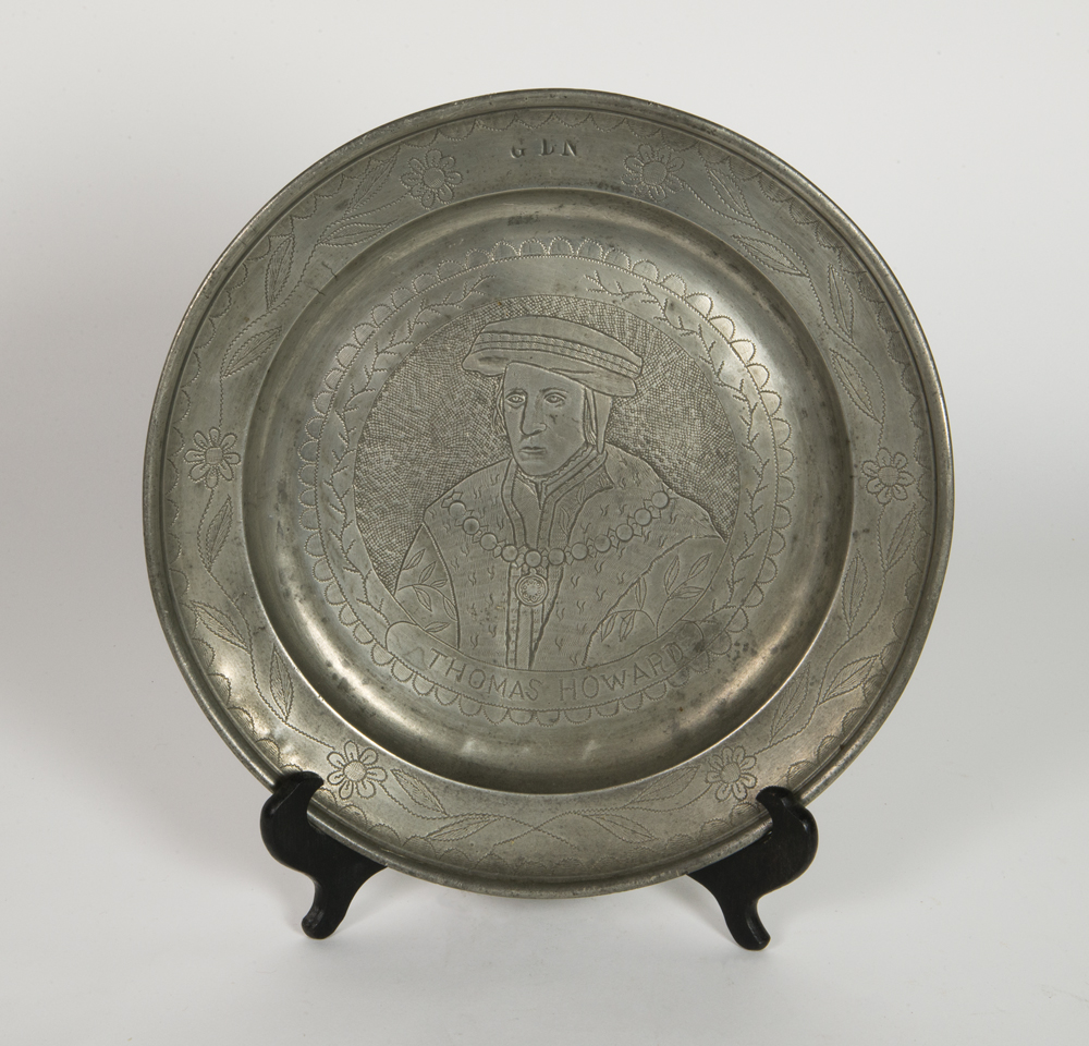 Plate with engraved figure of “Thomas Howard”, (Uncle of Anne Bolyn), touchmarks on back, “GDN” in floral border, some minor denting, overall good condition, 12″ dia.