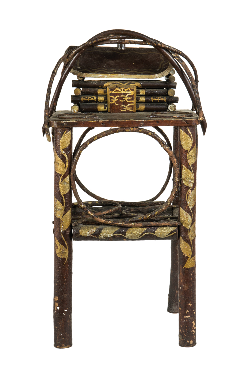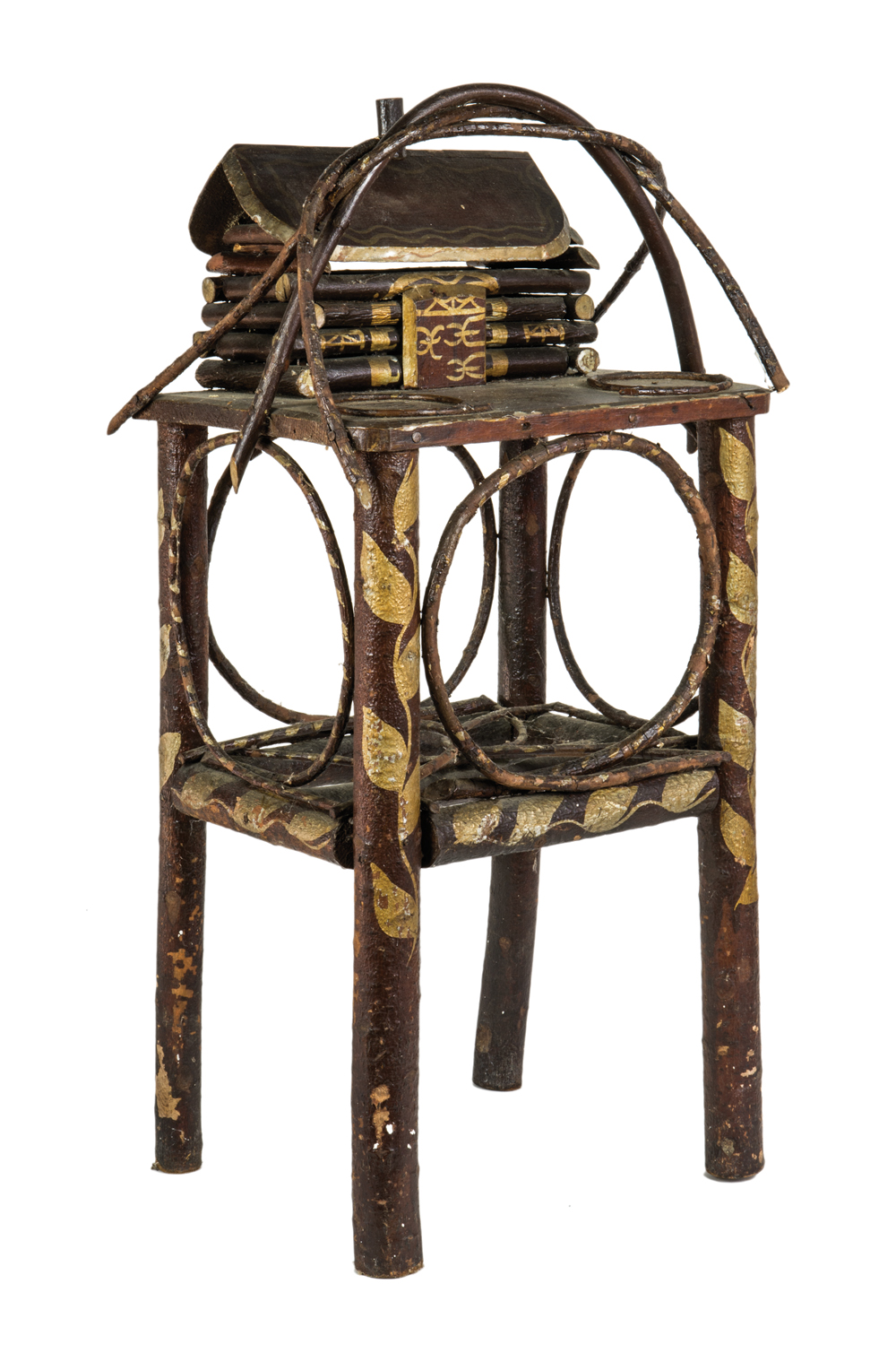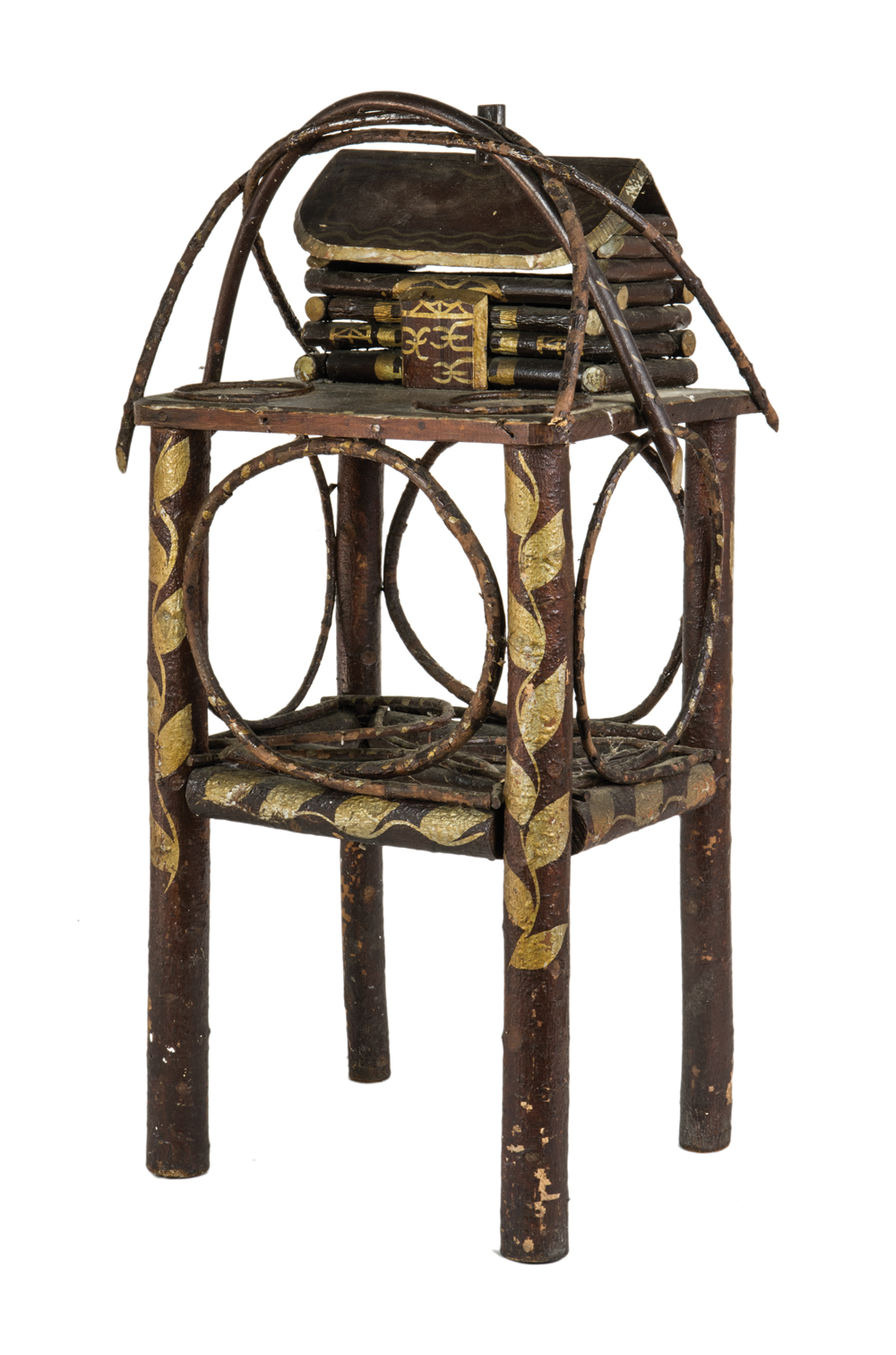 In an adirondack style, original paint, cabin on top with curved pieces of wood, gold leaves against a copper colored background, the door and roof of cabin are also finely painted, appears to have two cup holders on top, 28″ h, 14″ w, 10″ d.