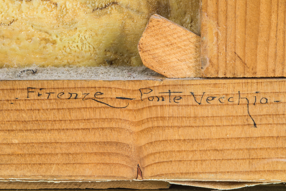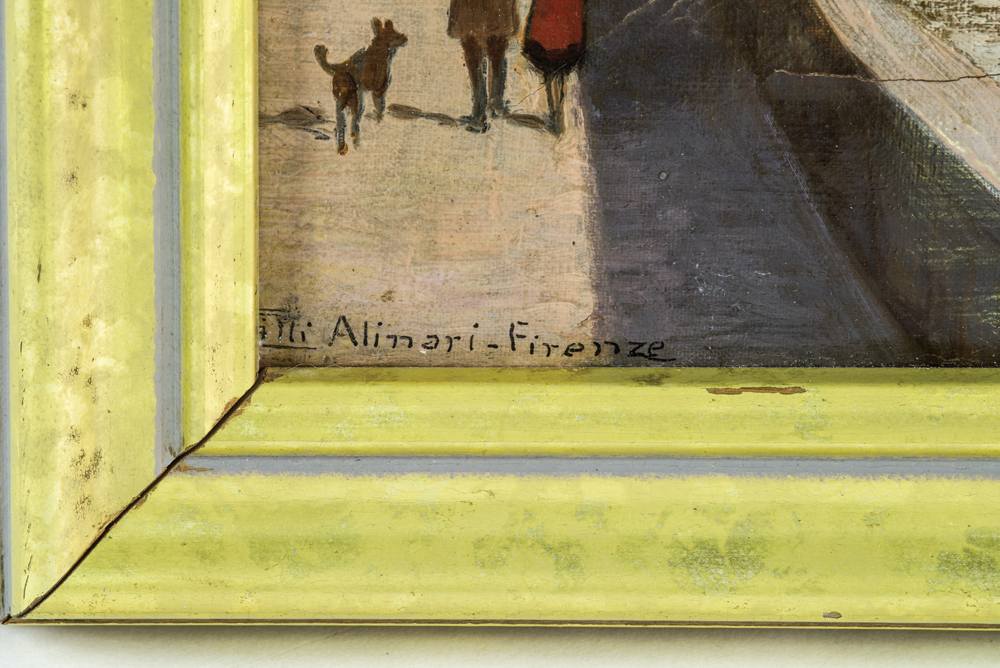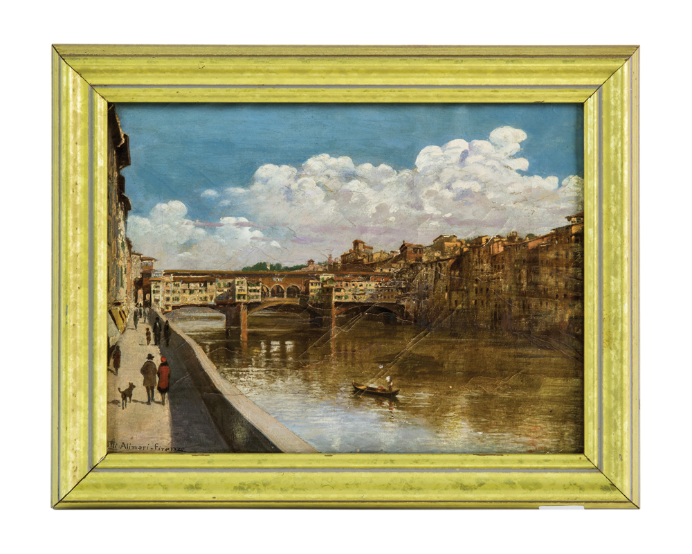 River scene, Florence, Italy, signed l.l. “Fratelli Alinari – Firenze”, shows the “Ponte Vecchio”, with man and woman walking with a black dog, (wax back).