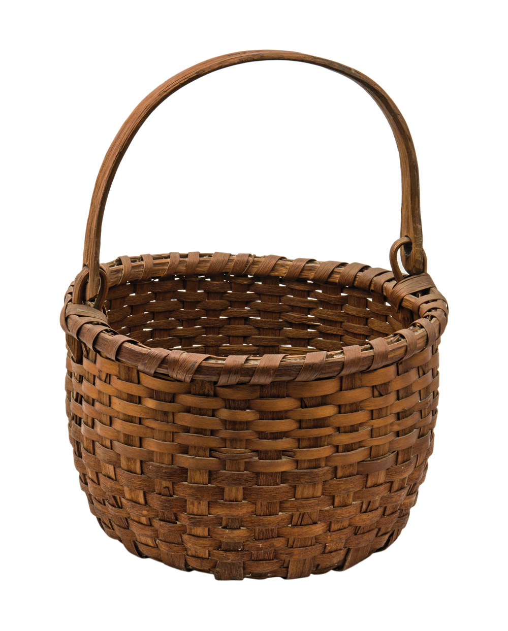 Black ash, carved hoop handle with carved wood ears, single wrapped round rim, overall good condition, 7″ h (to rim), 13″ h (to top of handle), 10″ dia.