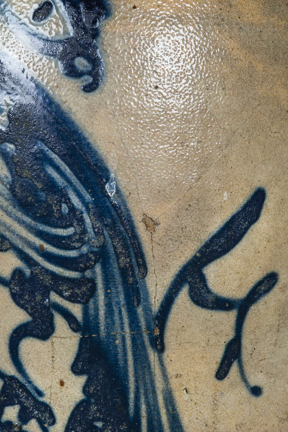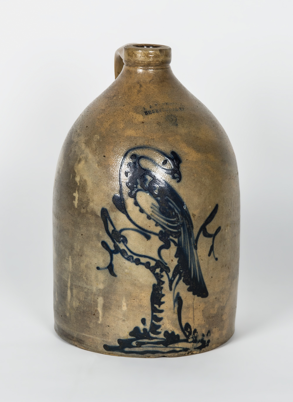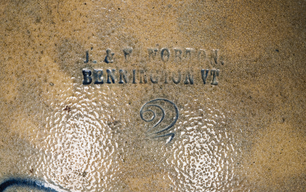 Two-gallon jug, “J & P Norton, Bennington, VT”, with a cobalt blue bird on a branch, overall good condition, minor in-use chips.