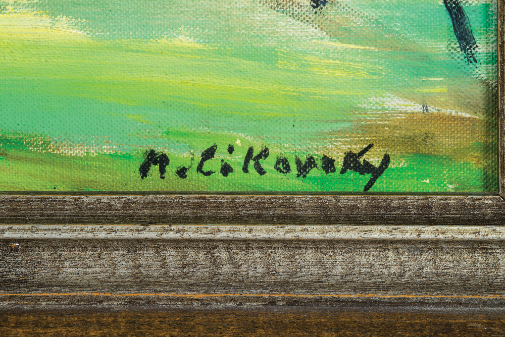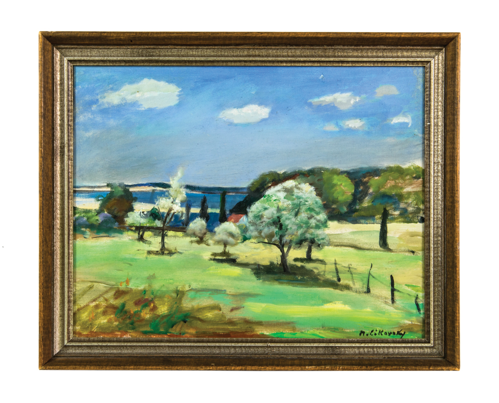 Oil on canvas, summer landscape with trees, impressionist style, water and beach in background, signed l.r. “N. Cikovsky”, (Nicolai Cikovsky, New York/Poland, 1894-1984), 13 1/2″ x 17 1/4″.
