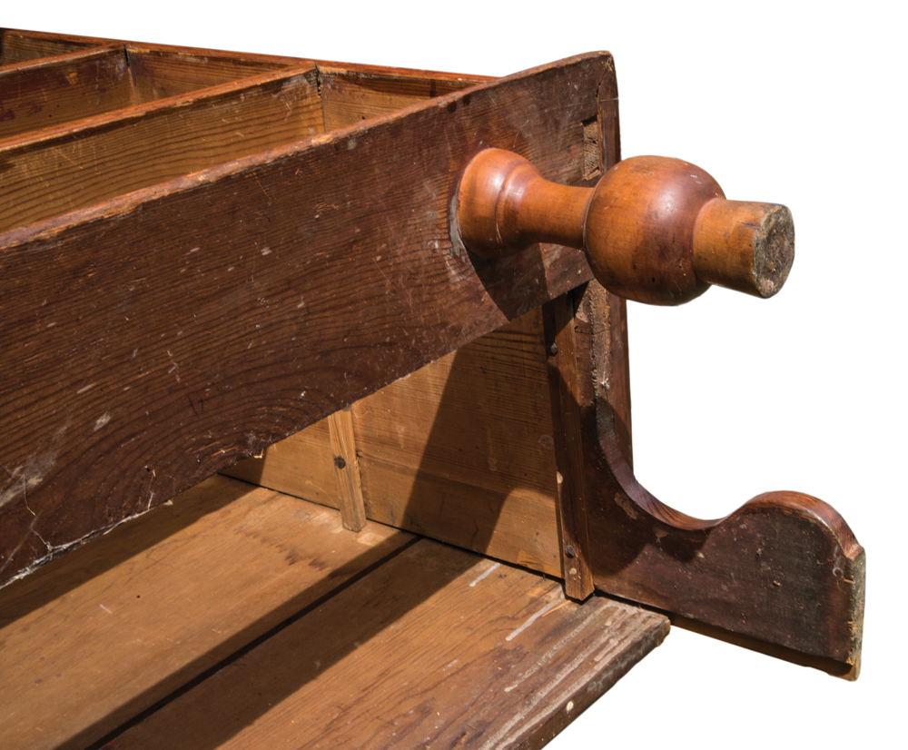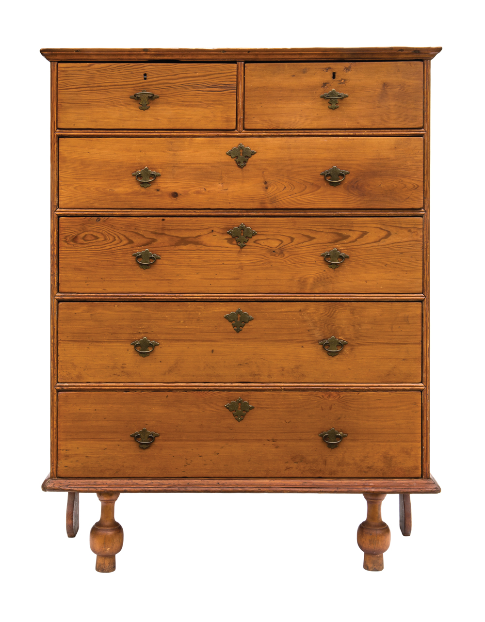 Yellow pine, applied molded top, dovetailed case, old punch decorated batwing brasses (possibly original), double arch molding separating graduated drawers five high with split top drawer, tall turnip turned feet in front, sides, continuing to form feet in back, three board back, rosehead nailed, c. 1720-1730, found in Virginia, 50 1/2″ h, 37 1/4″ w, 18″ d.