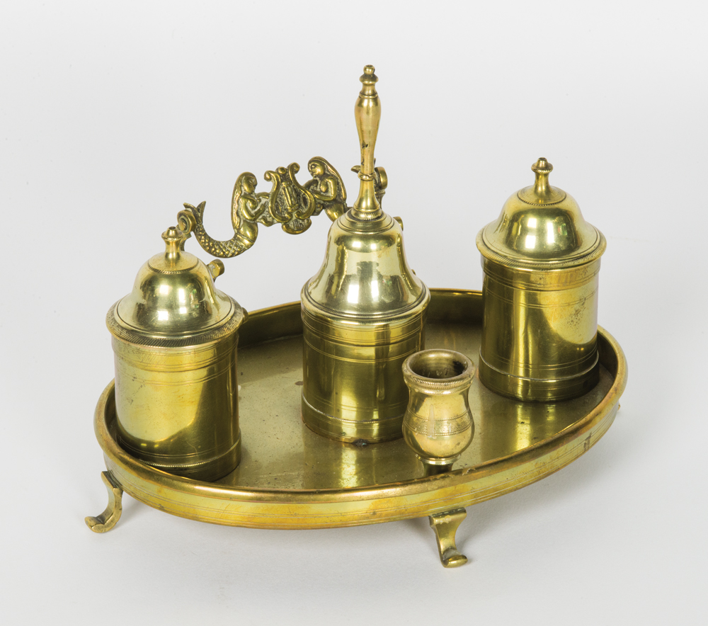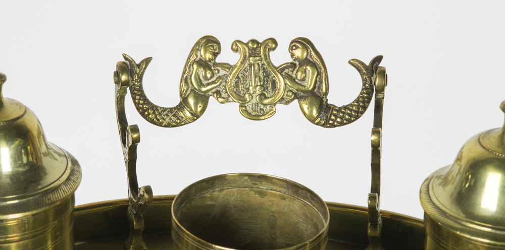 Lidded inkwell with original glass insert, lidded brass sander, brass bell on stand, and brass candleholder, figural double quill holder with surmounted facing mermaids holding a harp between them, all on four curved feet, (possibly made for a ship captain), 3 1/2″ h, 7 1/2″ l, 5 1/4″ d.