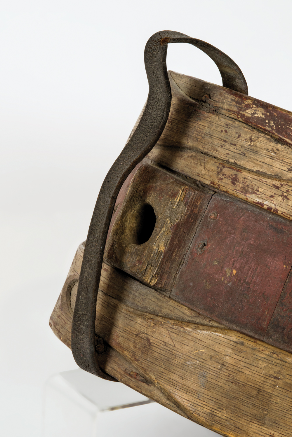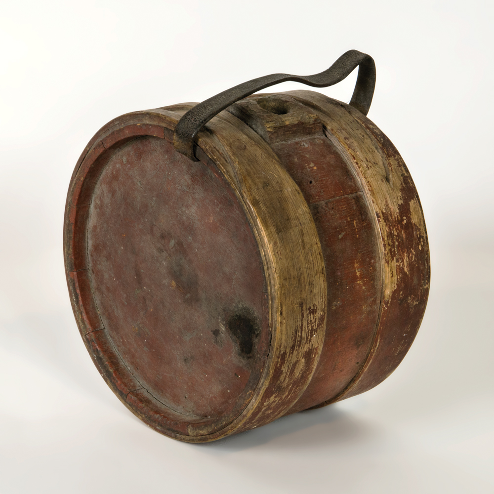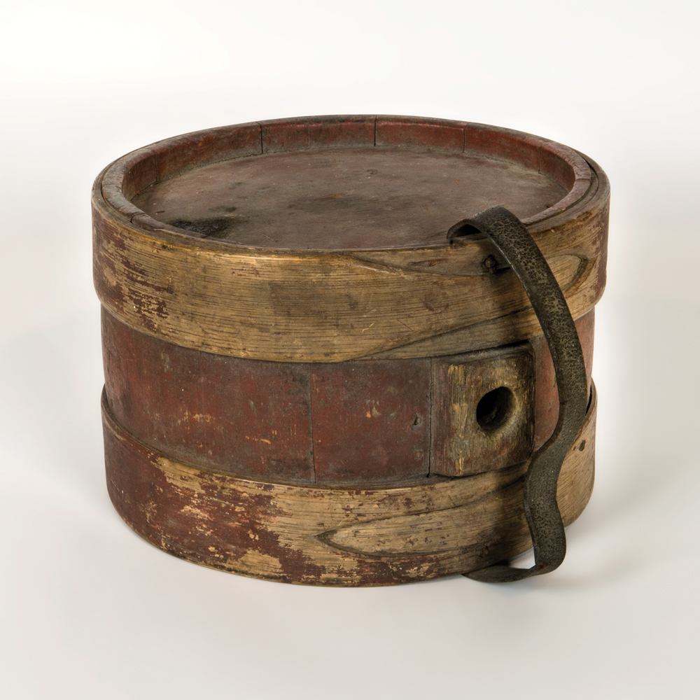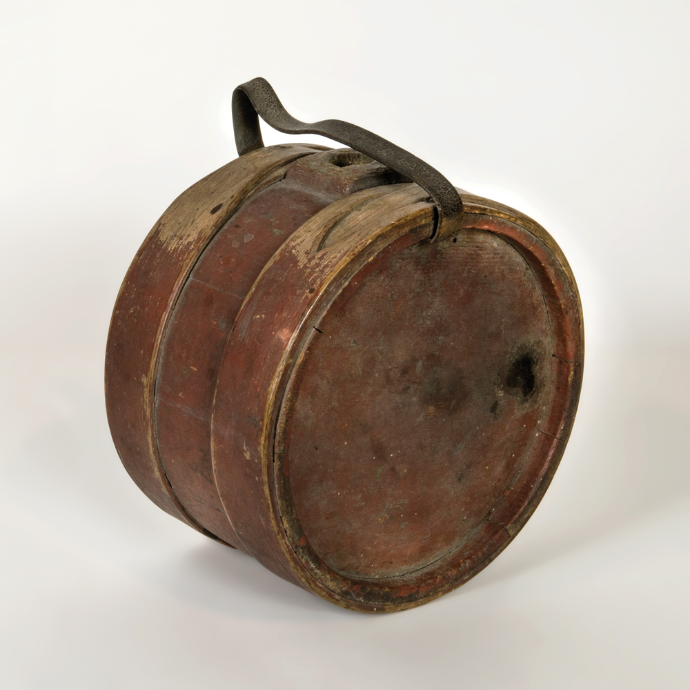 Round pine canteen, in original red, with leather strap handle, dry patinated finish, interlocking fingers, 10″ dia.