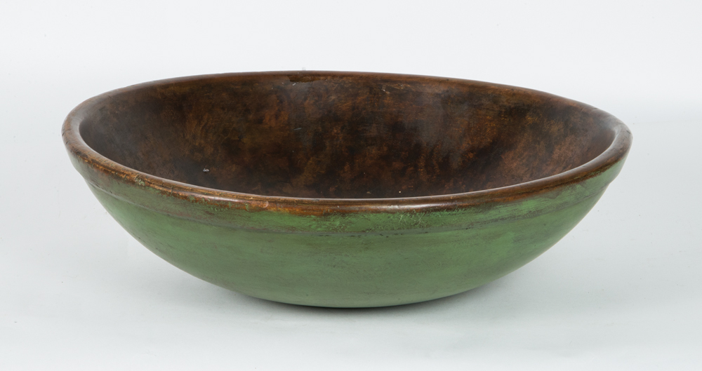 Turned wood bowl, in old green painted finish, good condition, 20 1/2″ dia.