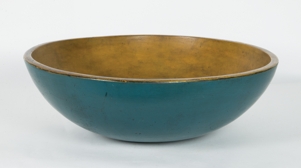 Turned wood bowl, in 20th c. blue painted finish, good condition, 24″ dia.