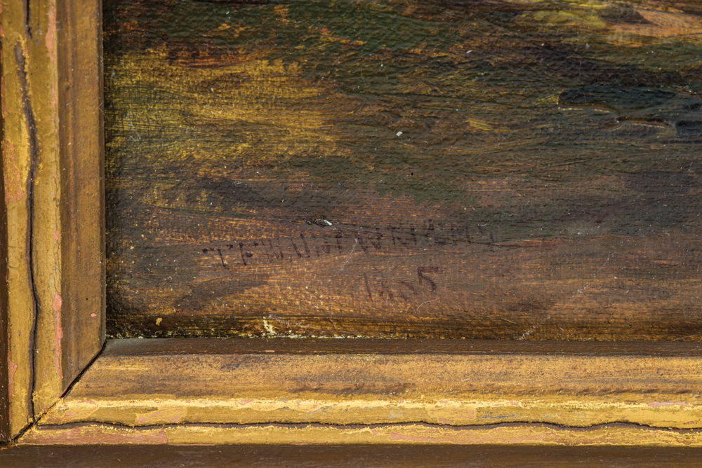 19th c. oil on canvas, showing a herd of cows with a village in the distance, clouds at sunset, signed l.l. “T.F. Wainewright”, (Thomas Francis Wainewright, United Kingdom, 1794-1883), c. 1865, stenciled canvas “Wadsworth-Howland, Boston, FW Devoe & Co, New York”, some in-painting in the sky, framed, 11″ x 15″.