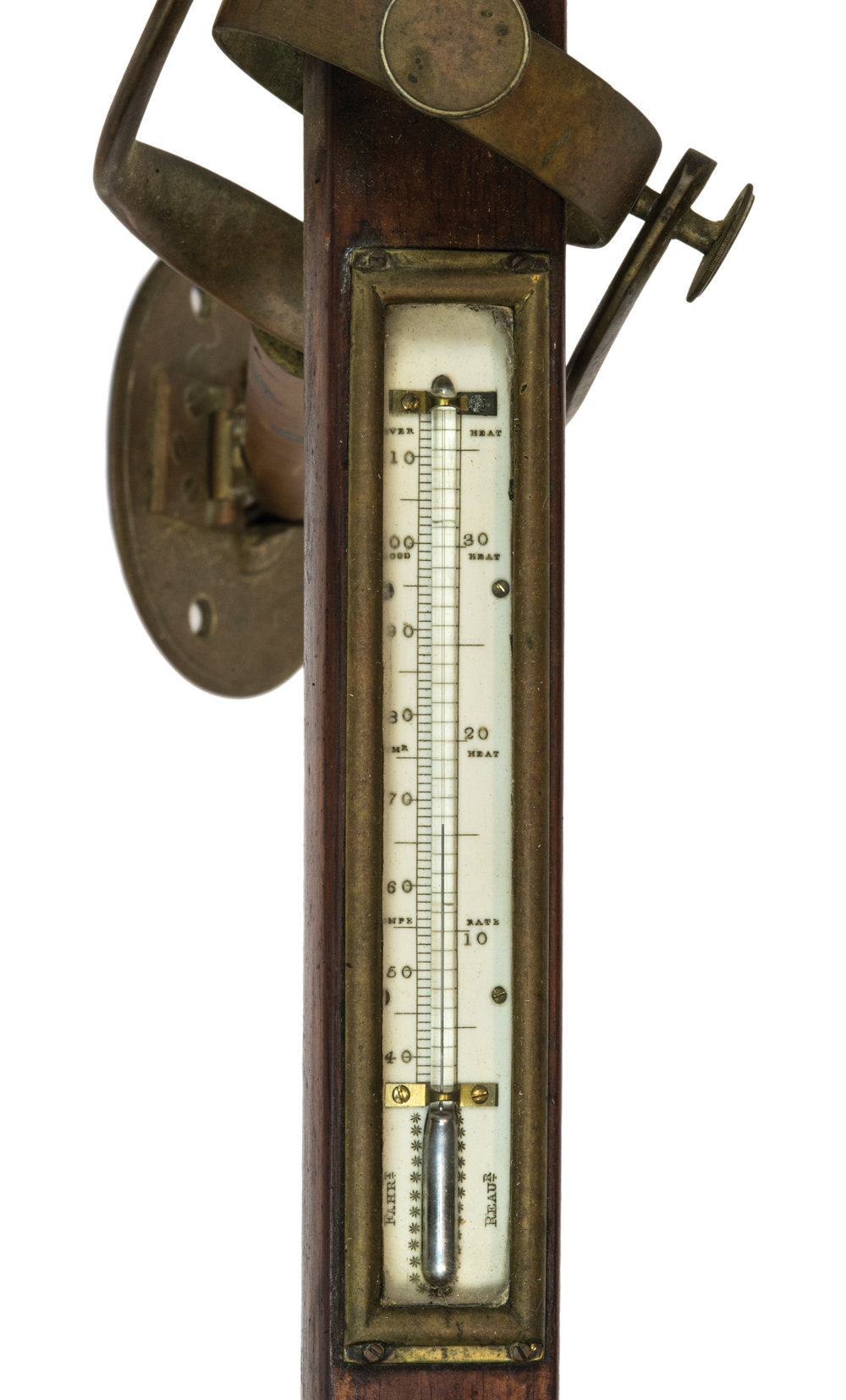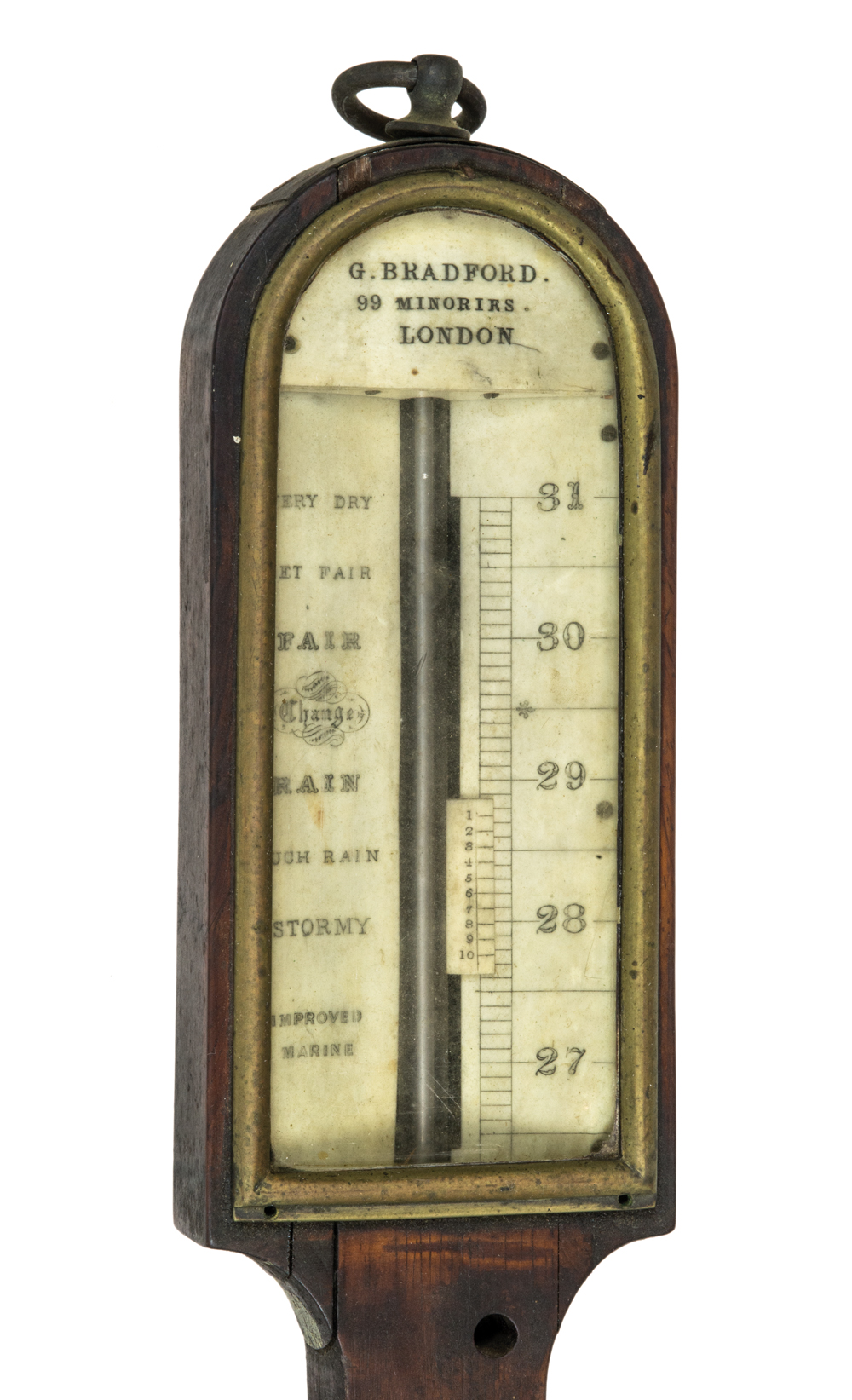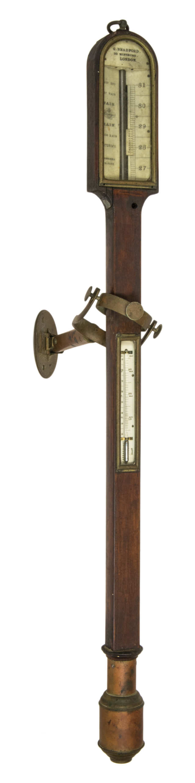 Mahogany cased stick barometer, on brass gimballed arm, signed “G. Bradford, 99 Minories, London”, intact scale indicator, brass tube base, (note: probably usesd on Ship Avon as from the Hingham, MA family), as found condition, 36 1/2″ l.