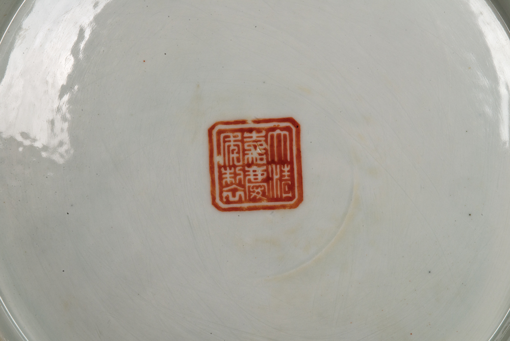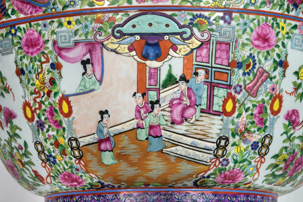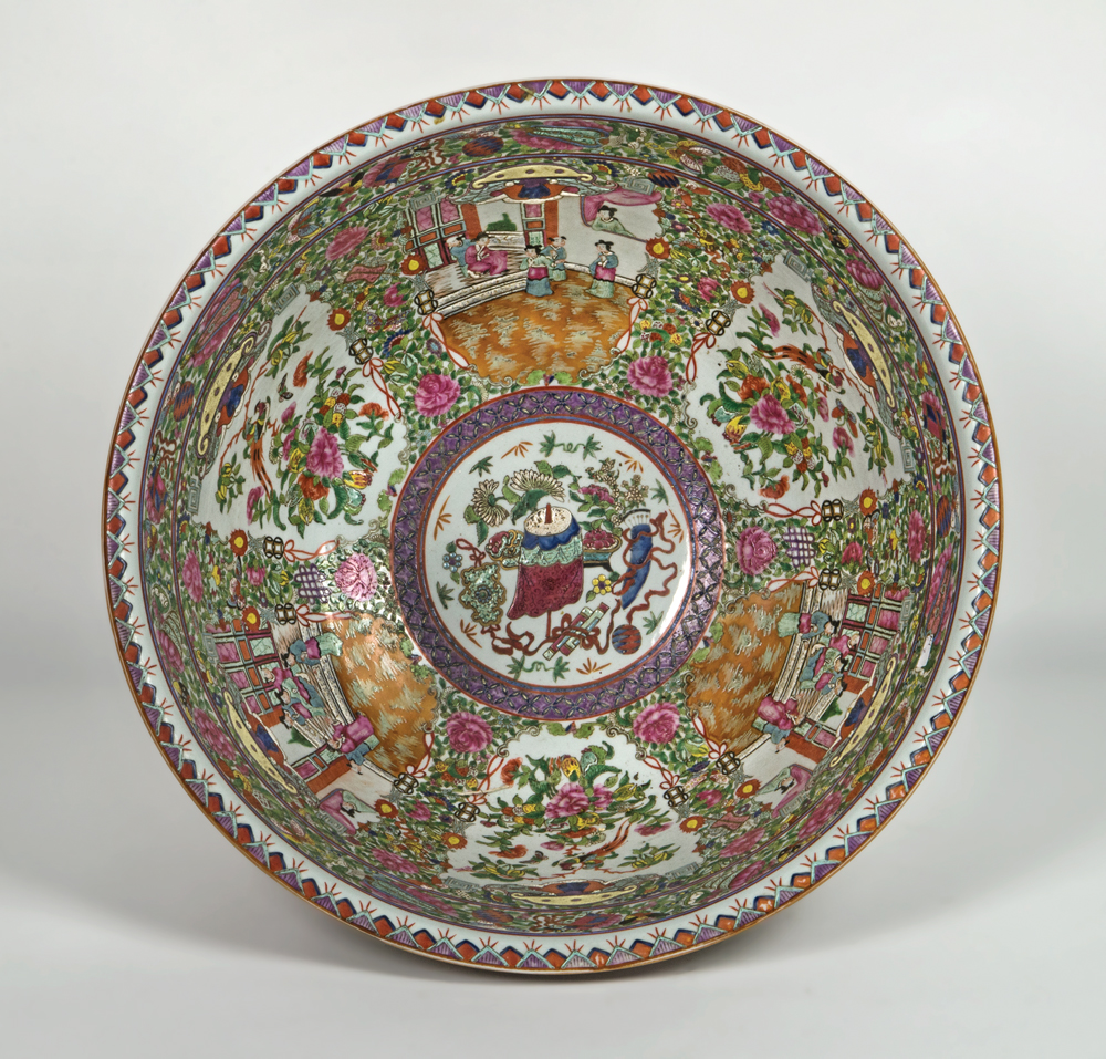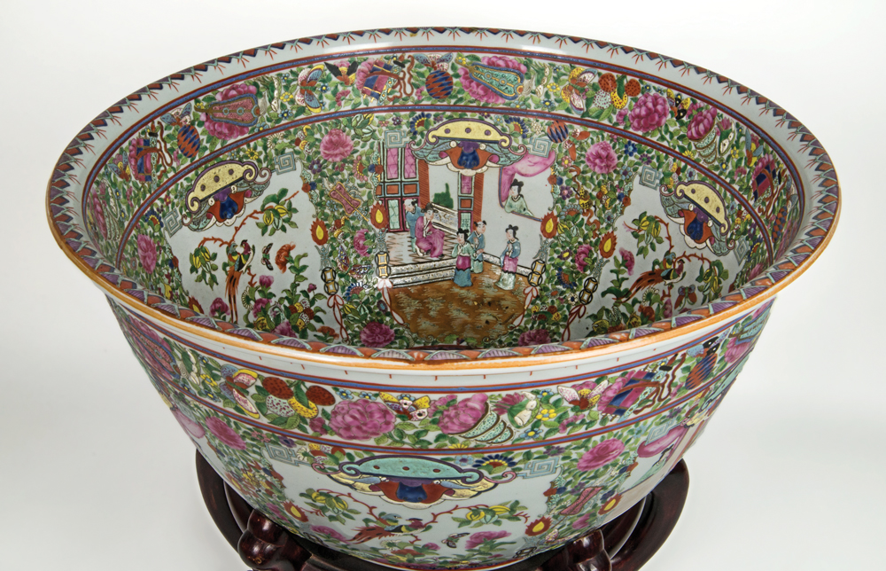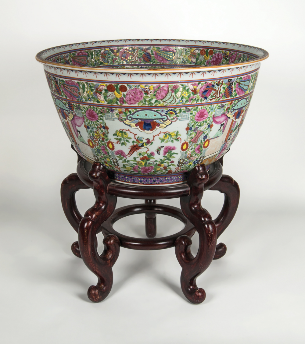 Large Koi bowl, on Chinese rosewood stand, shows panel scenes of Palace, includes figures, flowers, birds, fruit, interior decorated as well, 10 1/2″ h, 20″ dia.
