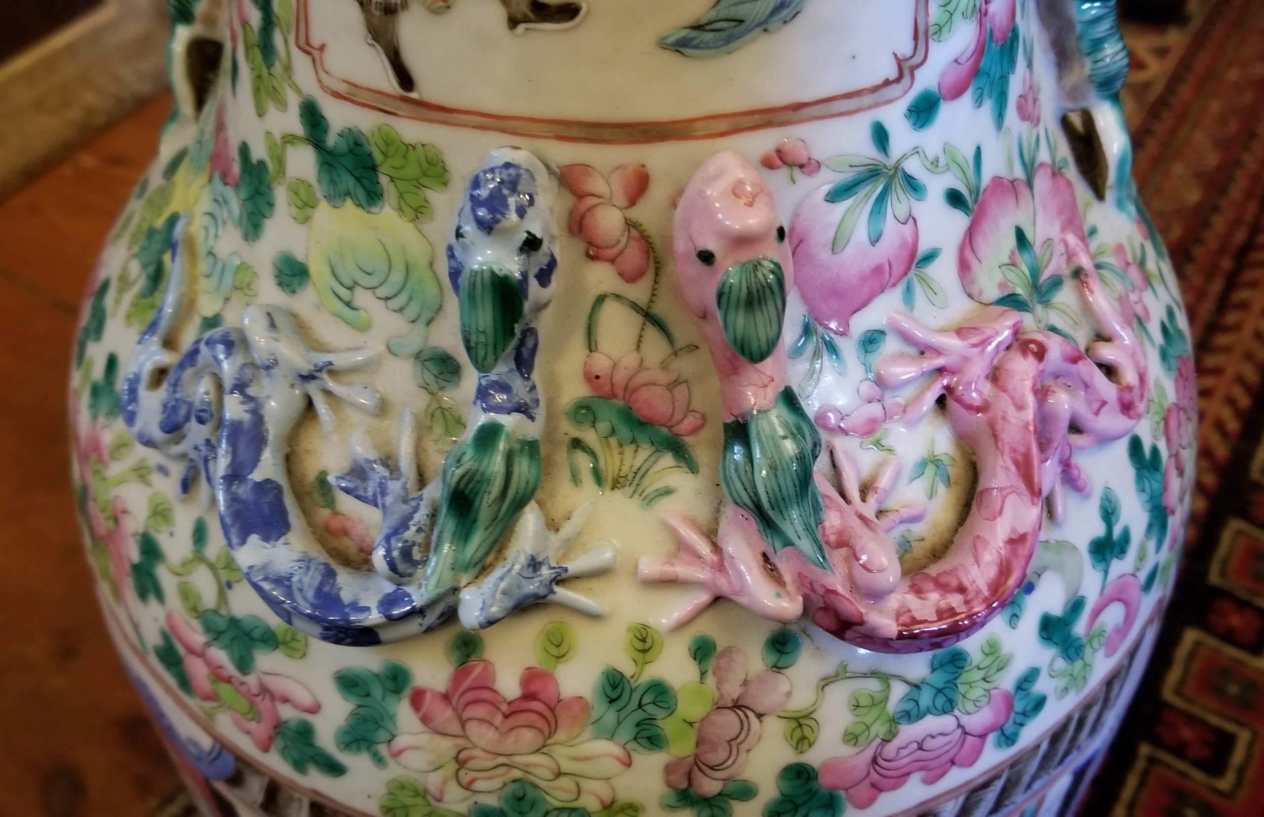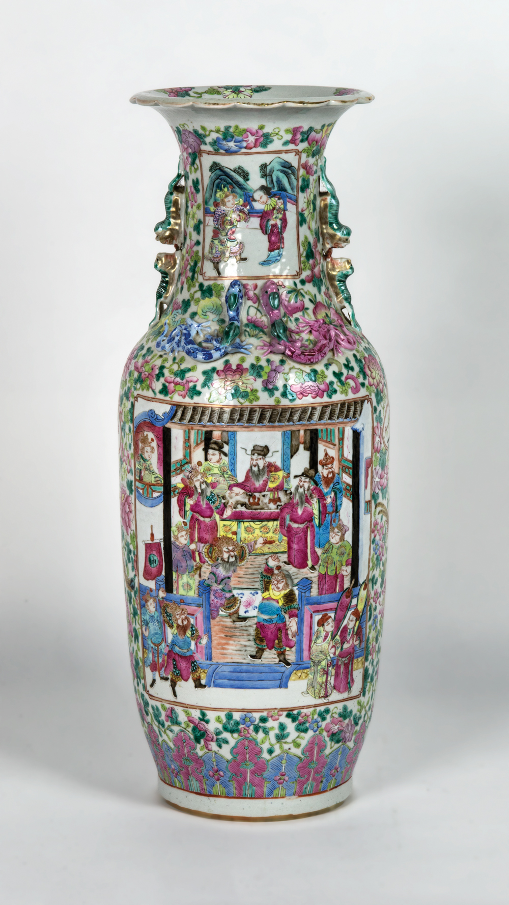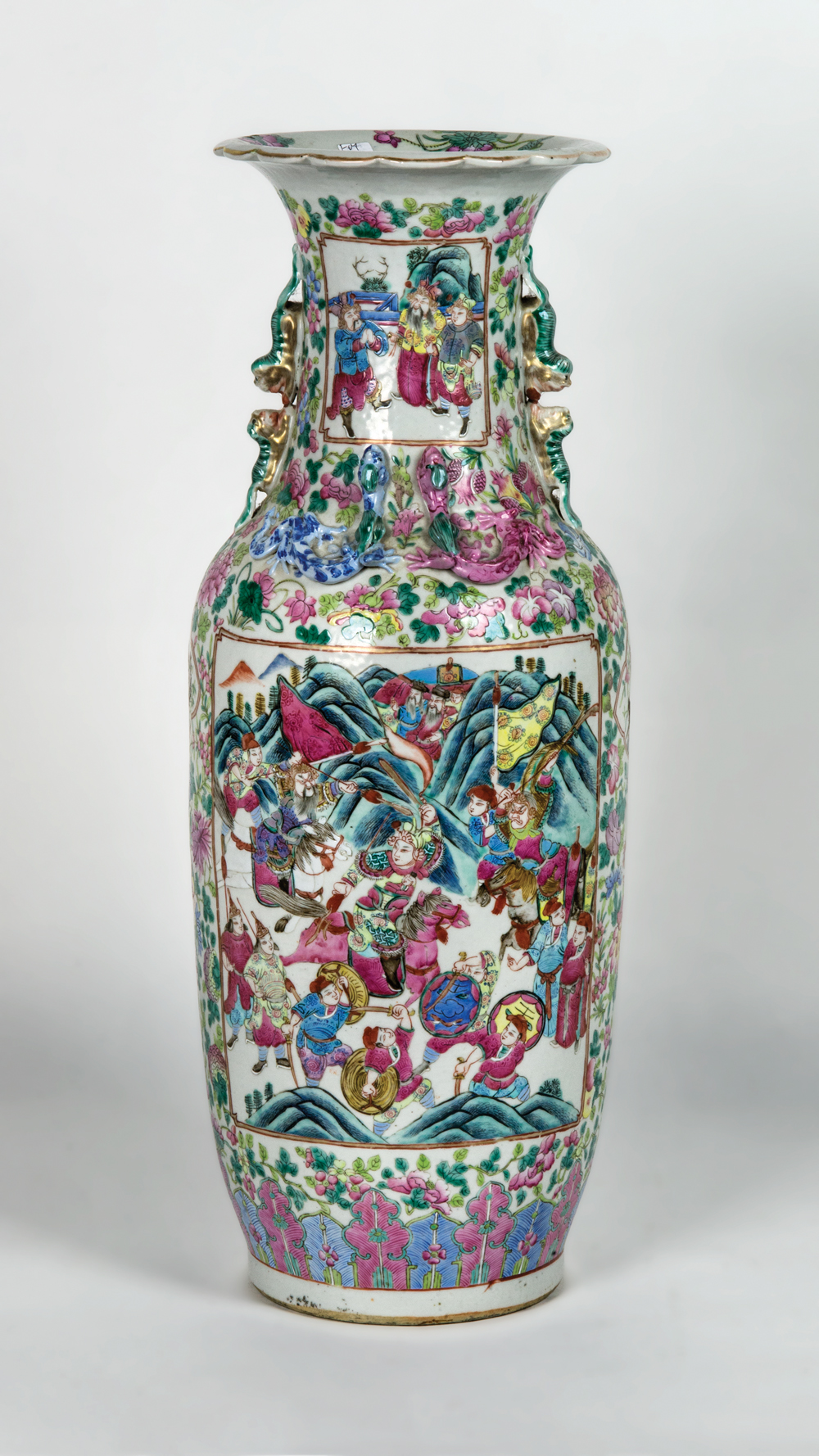 Late 19th/early 20th c. large porcelain vase, cartouche war scenes and military historical events, applied guardian dragons, and other beasts at the collar, scalloped rim, 24″ h, 7 1/2″ dia (at base).