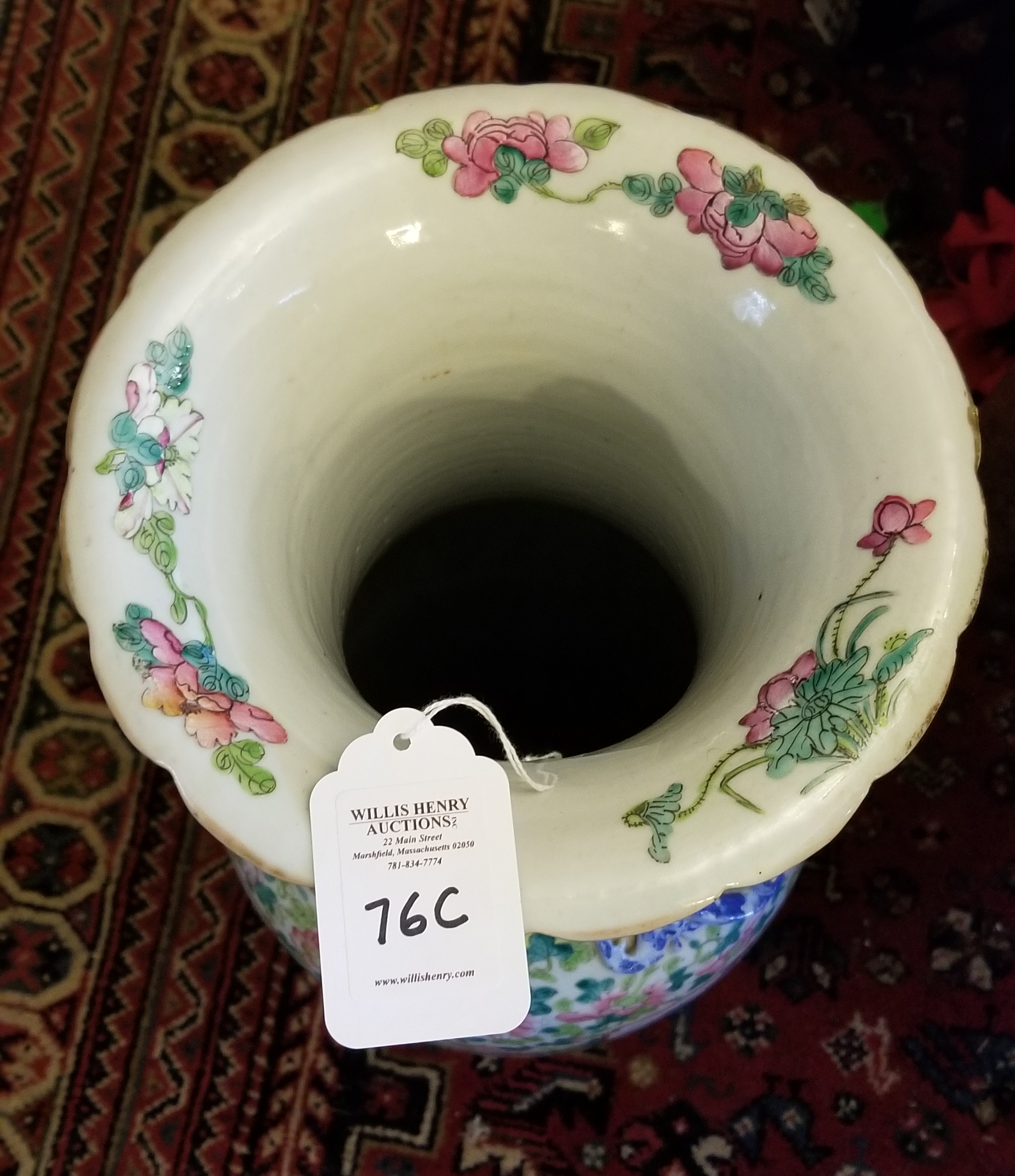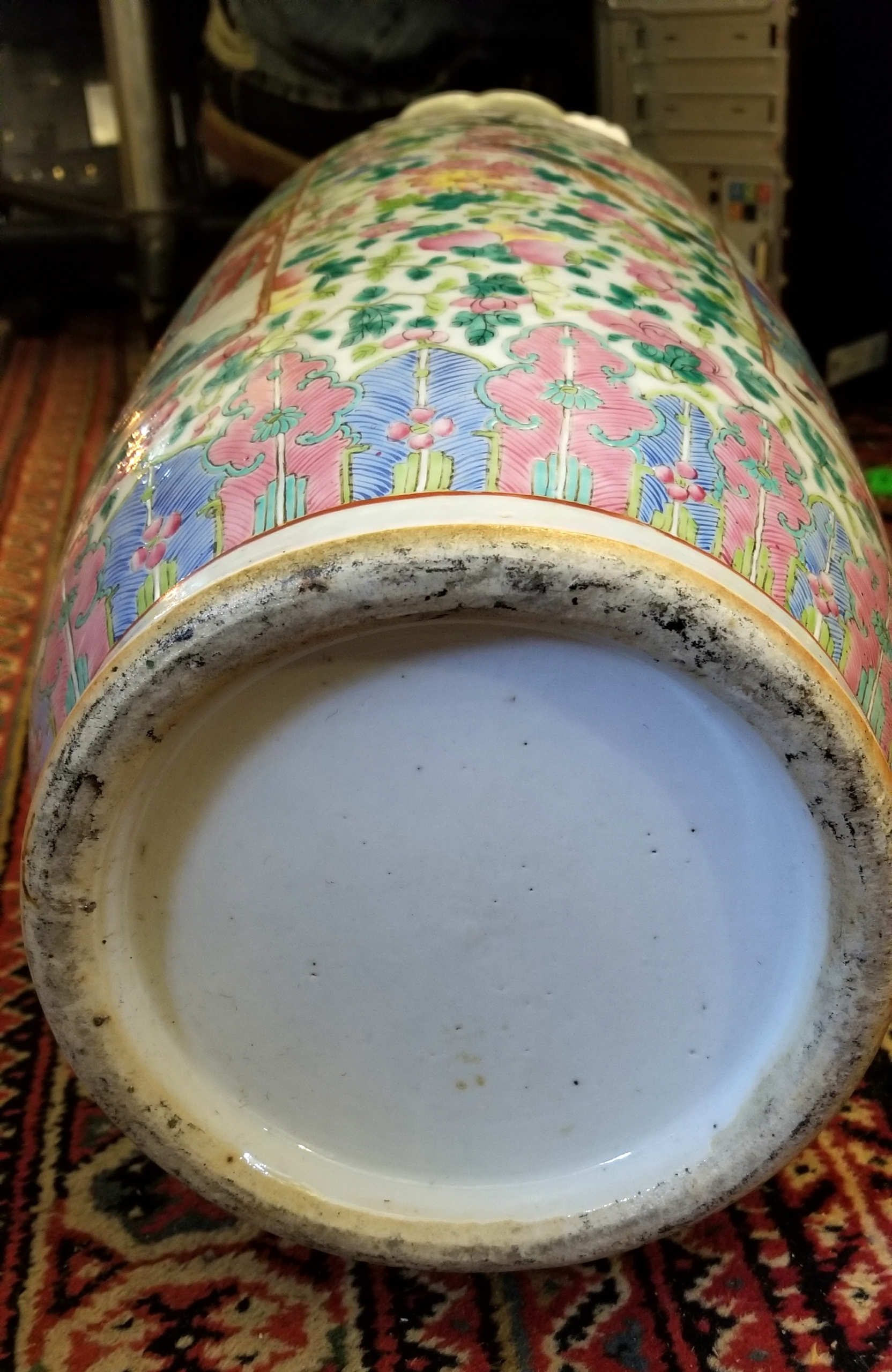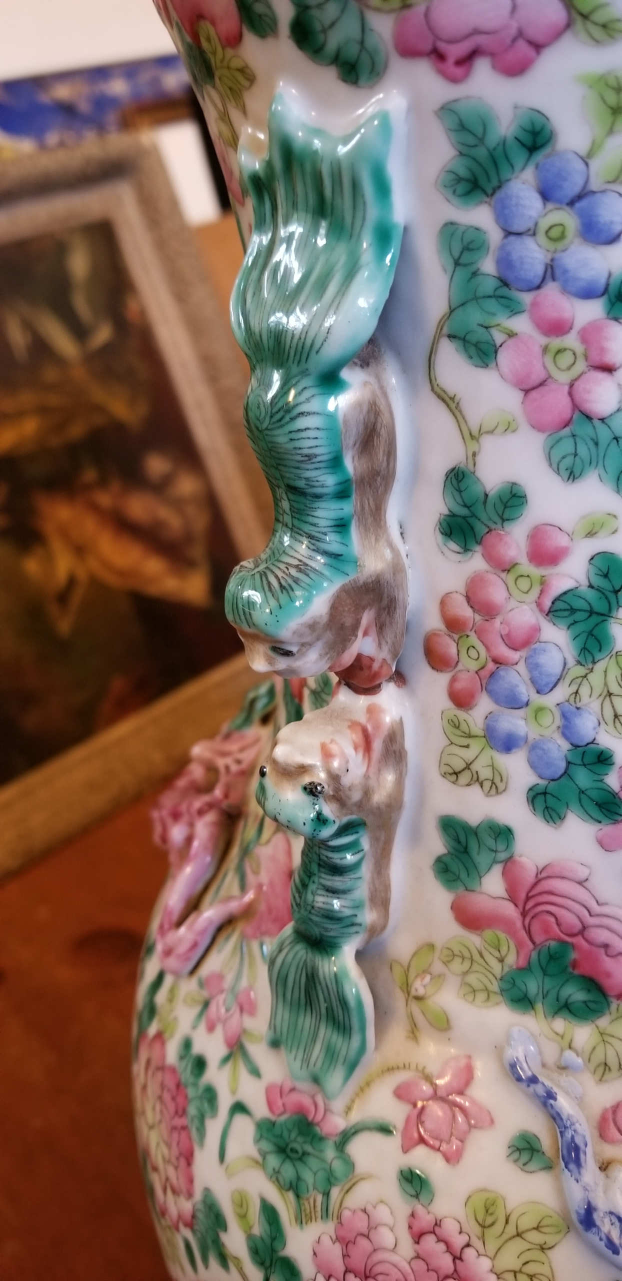 Late 19th/early 20th c. large porcelain vase, cartouche war scenes and military historical events, applied guardian dragons, and other beasts at the collar, scalloped rim, 24″ h, 7 1/2″ dia (at base).