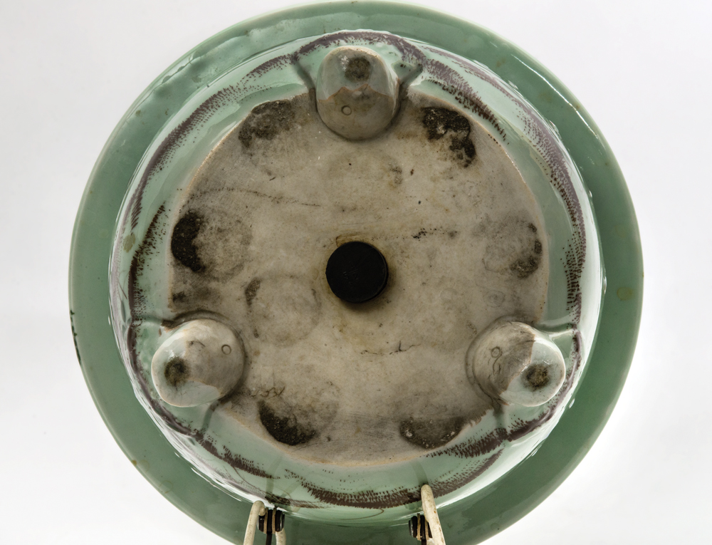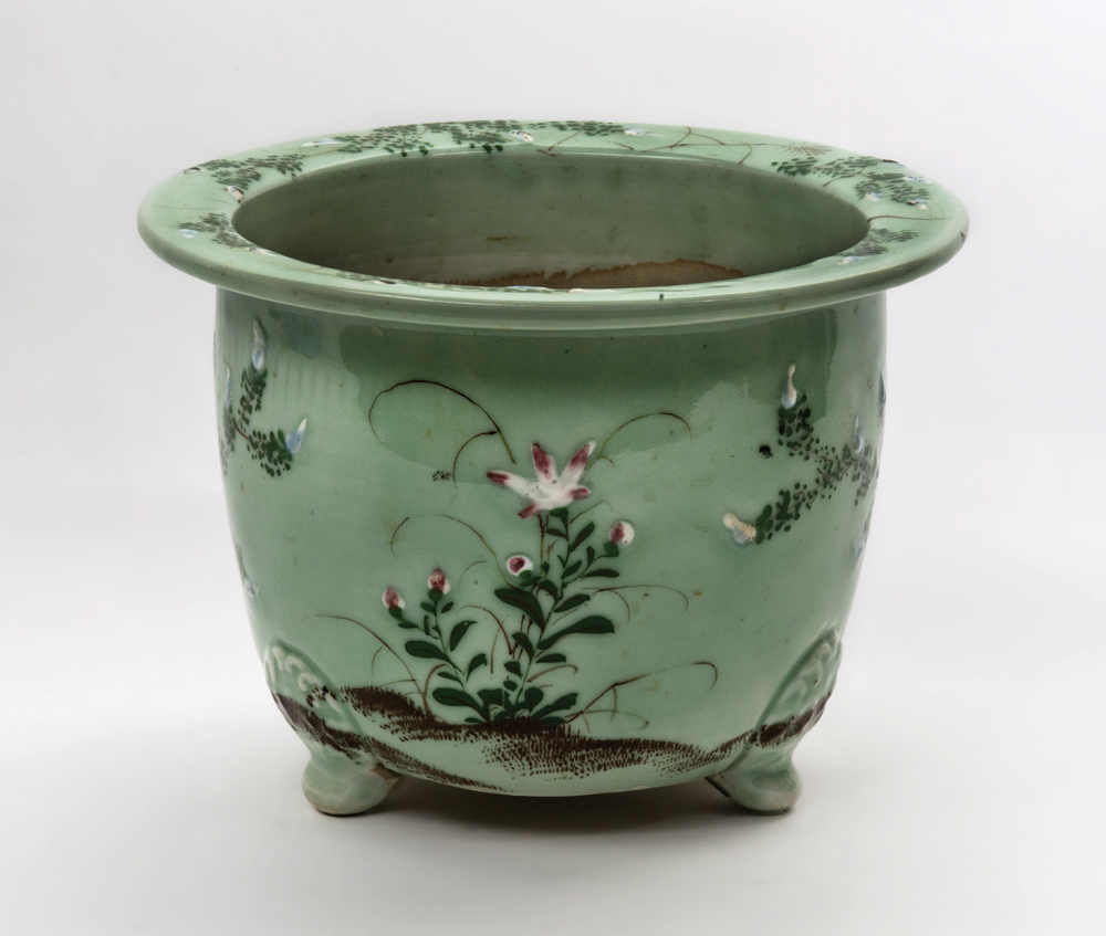 Green celadon glazed planter, similarly decorated as lot 77A with pink chrysanthemums, footed, 9″ h, 12″ dia.