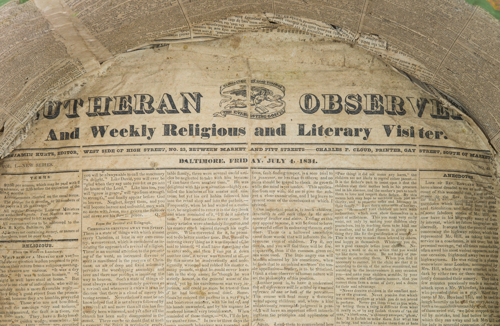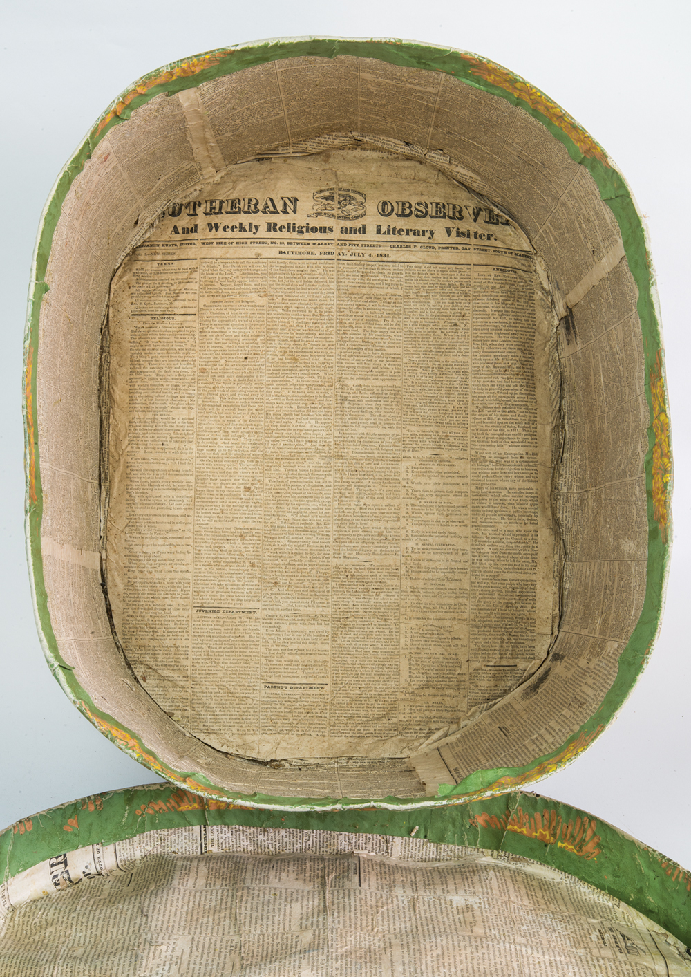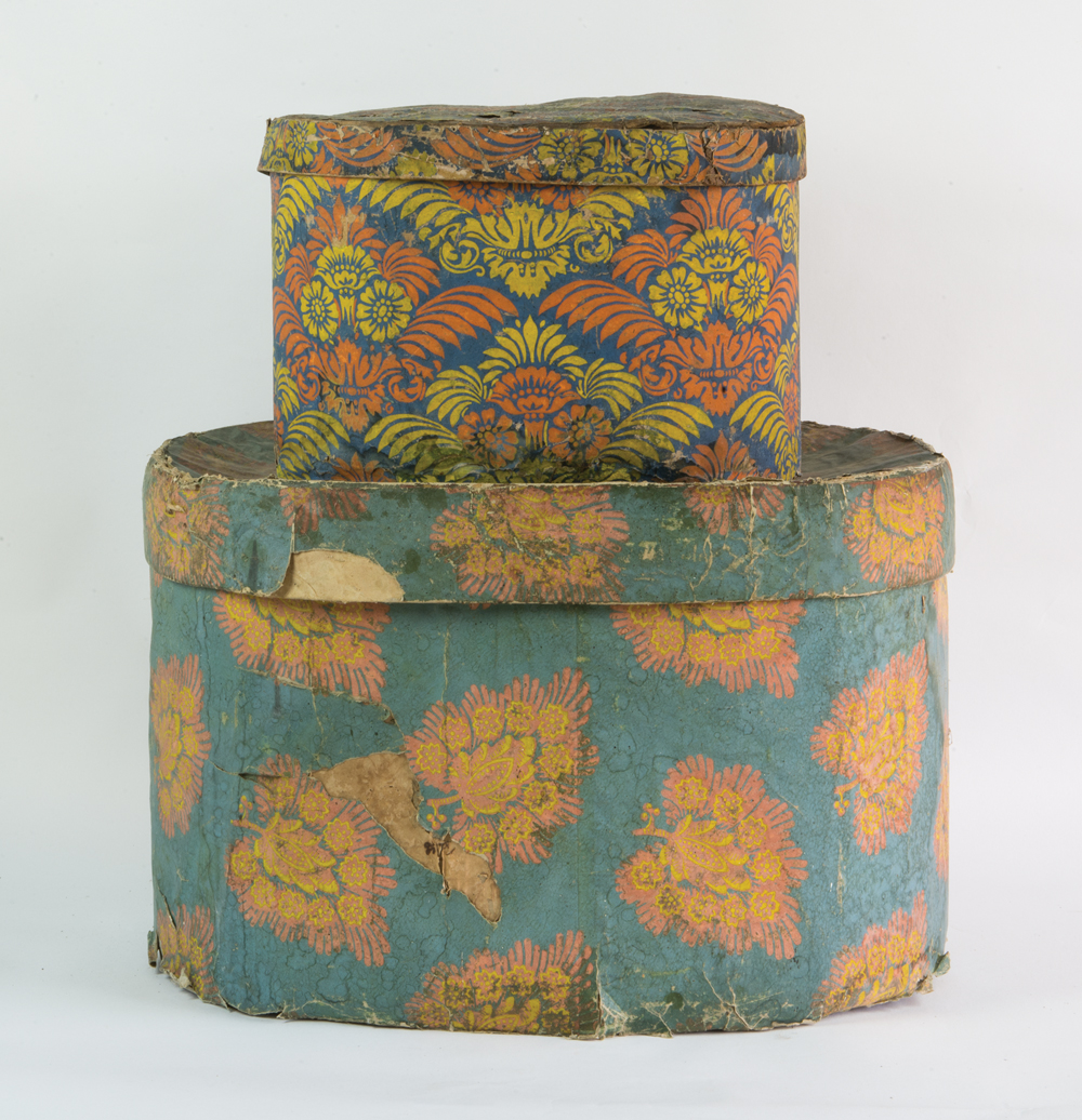 One lined with newspaper “Lutheran Observer, Baltimore, Friday July 4, 1834″, light blue floral wallpaper with yellow and pink, 14″ h, 22″ l; Smaller hat box with blue, orange and yellow wallpaper, 10″ h, 14” w; both show wear and some paper loss.