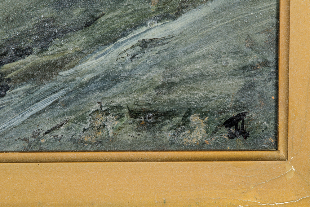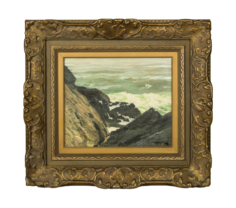 Marine painting, “Rocks and Surf”, Frederick J. Waugh, N.A. (American, 1861-1940), appears to be signed l.r., appears to be original frame, possibly exhibited “The Laura Davidson Sears Academy of Fine Arts, and the Elgin Academy, Elgin, Ill.”, 11 1/2″ x 14″ (sight), 21″ x 23″ (frame).