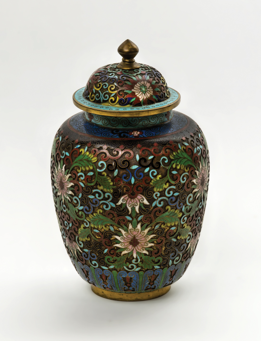 Early 20th c. jar, cloisonne enamel work, floral design with vines, (previously sold 2007 at Grogan Auction, lot 996), 10″ h.