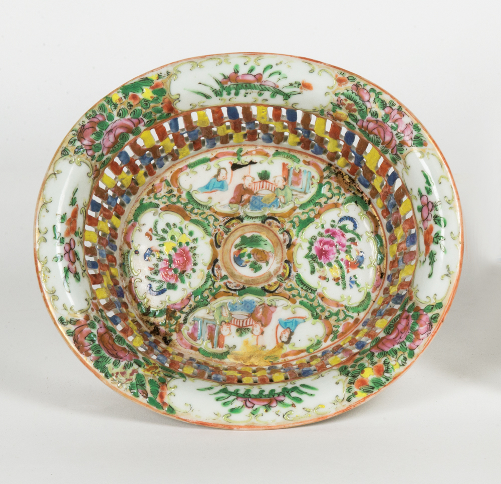 Mid 19th c. Rose Medallion fruit bowl, open work, multicolor, with figures and floral designs in base, and a matching underliner, with reticulated rim, (originally sold by Herbert Schiffer Antiques, Westchester, PA), 8 3/4″ x 7 1/2″.