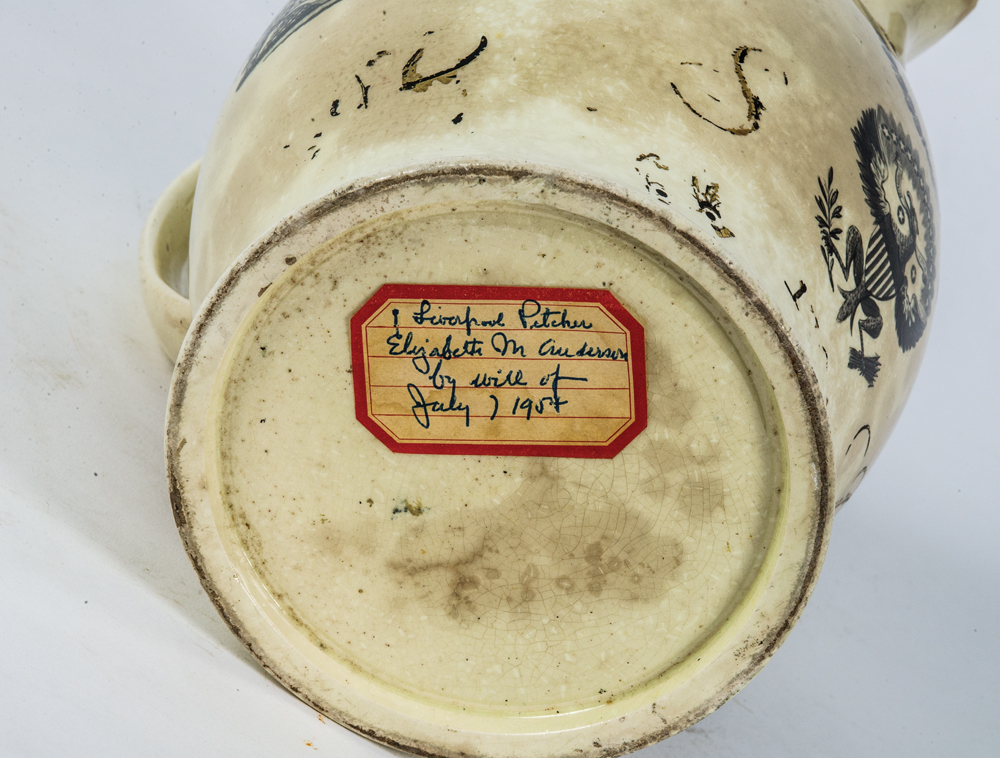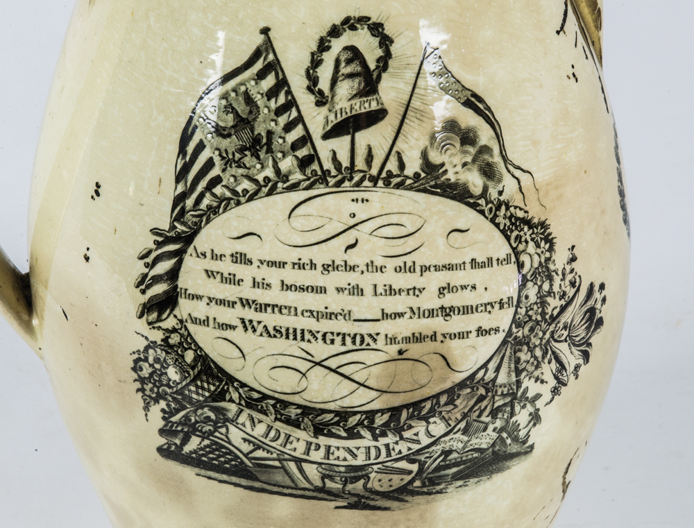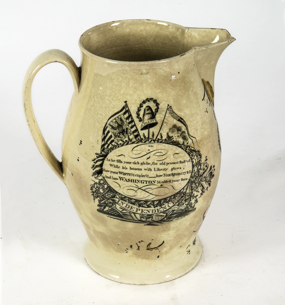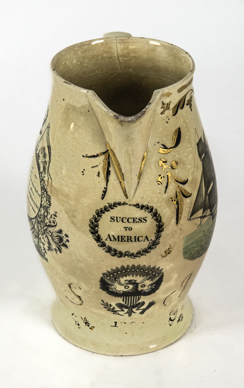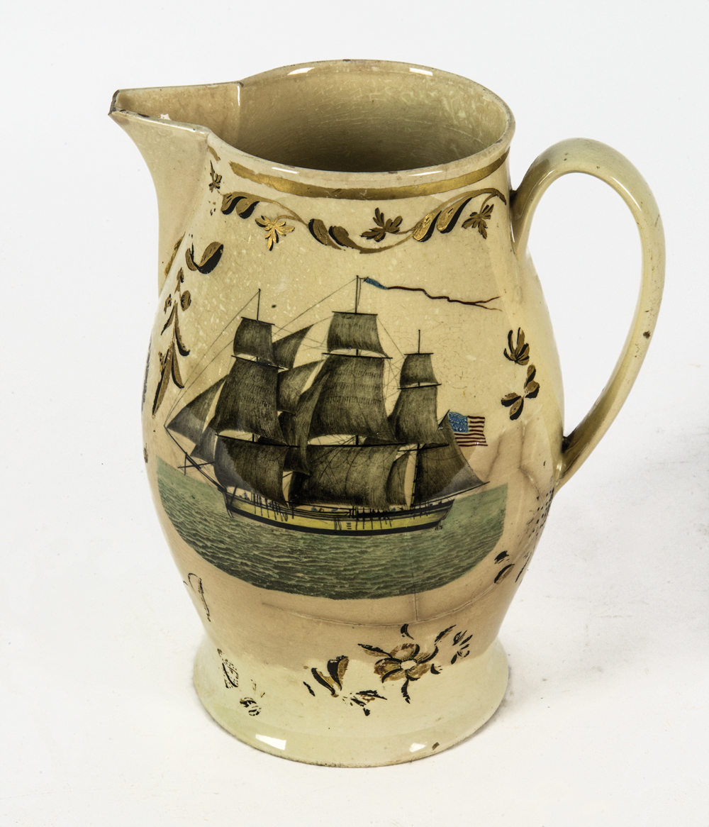 Transferware, showing a three-masted ship, “Success to America”, with spread wing eagle and shield, 13 stars with liberty hat, and Independence, chip on spout, body shows crack and staining, from a Hingham, MA estate, 11″ h.