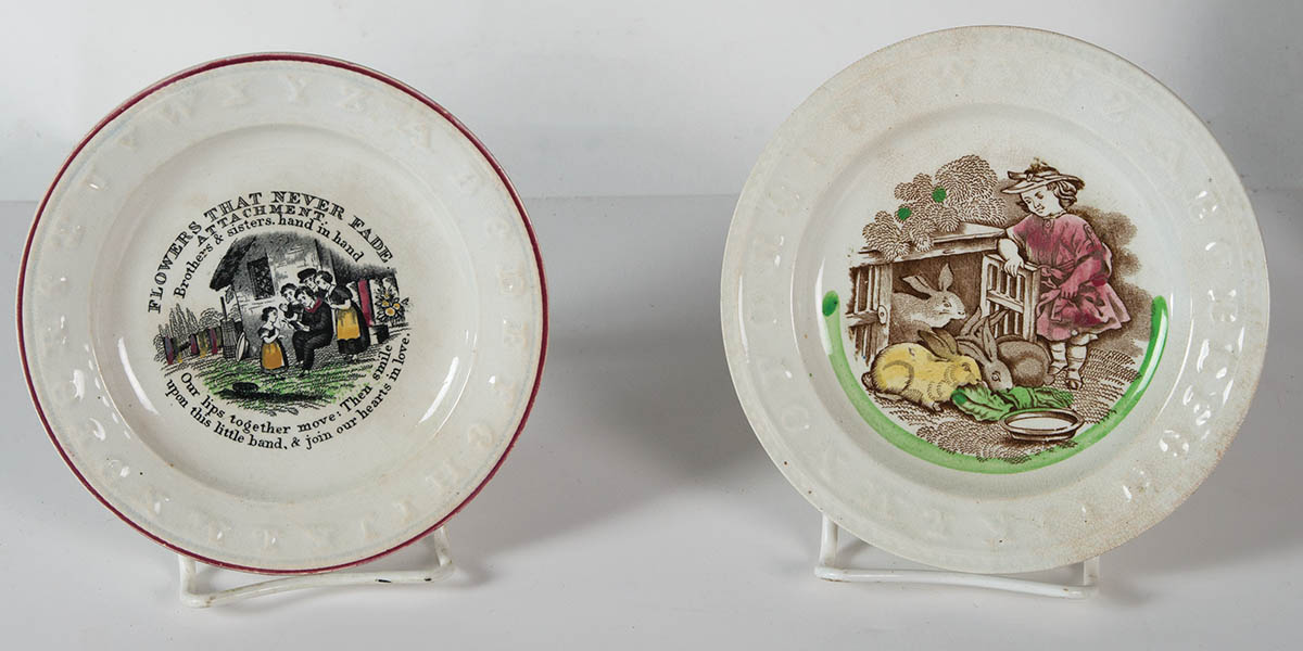 Alphabet “ABC” plates, all with raised letters, all in good condition except “Fox and Goose” shows a crack in rim, 8″ dia, and 7 1/2″ and 7″.