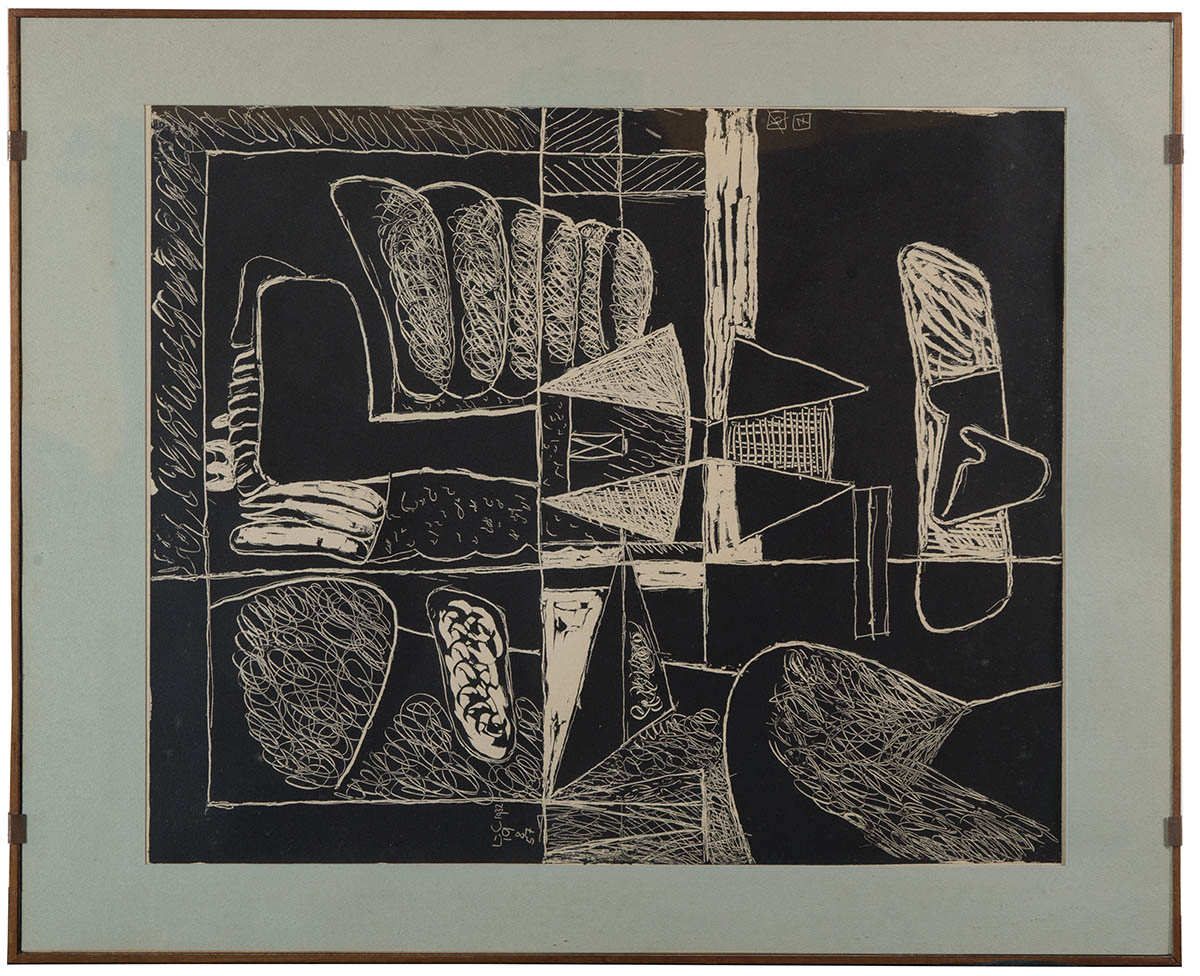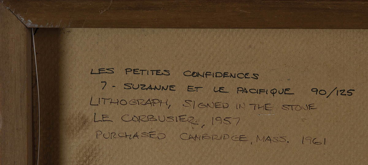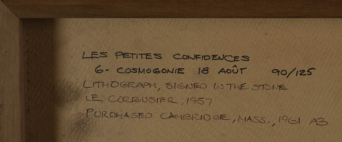 “Le Corbusier, 1957”, “6 Cosmogonie 18 Aout 90/125”, “Les Petites Confidences”, and “7 Suzanne et le Pacifique 90/125”, (both signed in the stone), “Le Corbusier 1957 Purchased Cambridge Ma. 1961.”, 17″ x 23 3/4″ (both sight), framed under glass with light green mat.