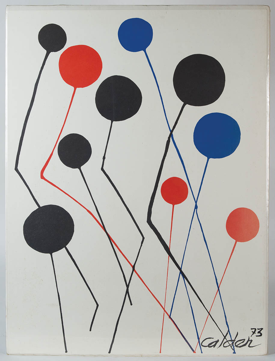 Calder, Alexander (1898-1976), American sculptor and artist, silkscreen print on paper, “Balloons”, showing 10 balloons in red, blue and black, dated 1973, minor foxing left hand side, 31″ x 23″.