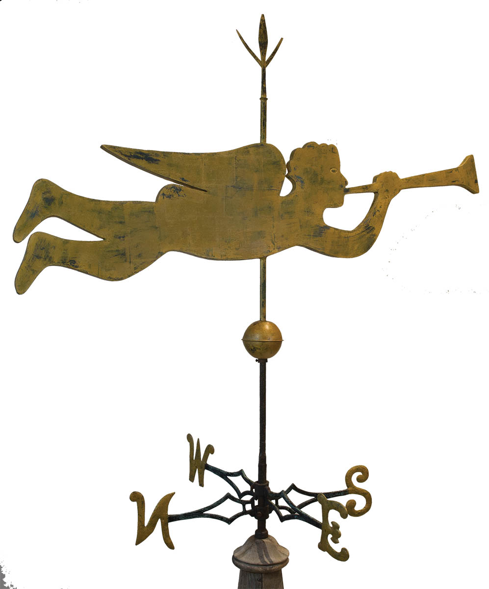 Rare copper weathervane, American, late 19th c., mounted on original iron and copper stand, with ball and directional letters, atop a later rustic steeple, very good condition, with worn gilded surface over the yellow sizing, 35″ h (including gilded ball), 52″ l, 3/4″ thick, 57″ overall h (including steeple).