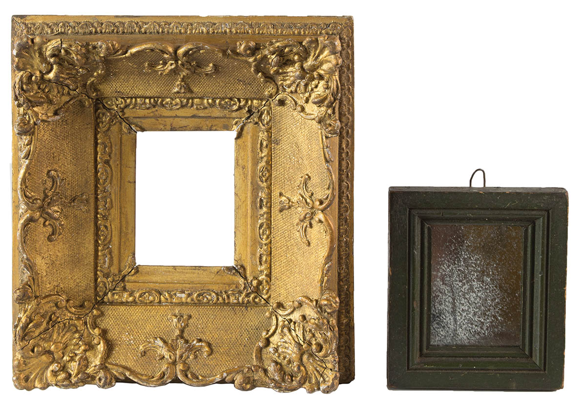 Pine, original green painted finish, holding an early glass mirror, wire loop hanger, 5 1/2″ x 4 1/2″; Finely carved and plaster frame for miniature portraits, gilded, 4″ x 3″ (inside), 10″ x 9 1/2″ (frame).