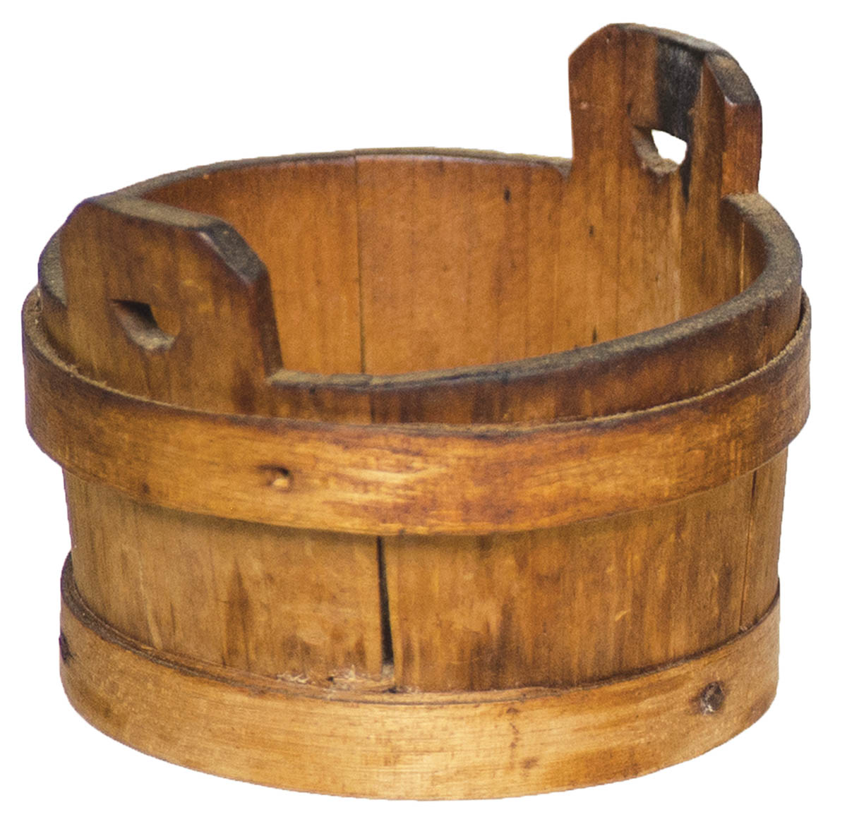 Pine, original finish, raised handles, stamped on bottom “CH” (Cotton Hersey), 2″ h (to top of handle), 2 1/2″ dia.