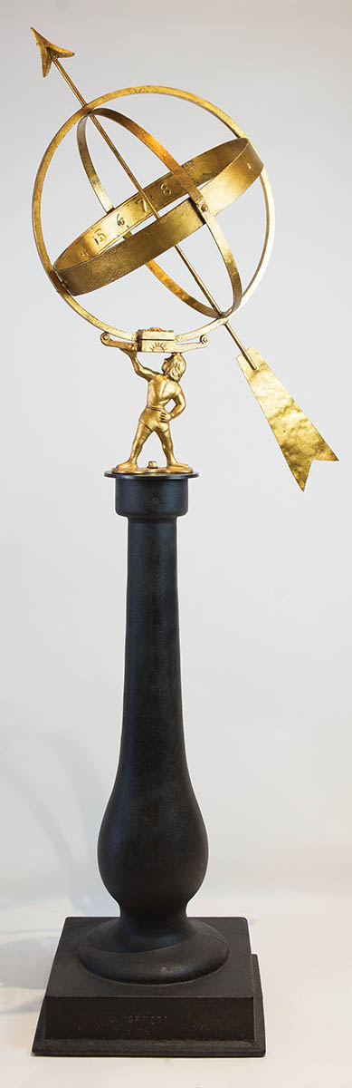Armilarry sphere, c. 1920-1940, gilded framework of rings representing astronomically important features as lines of longitude and latitude, and a gilded arrow runs through, with Atlas supporting the Heavens upon his shoulders, in copper, steel and molded metal, with cast iron base in black paint, approximately 6′ tall.