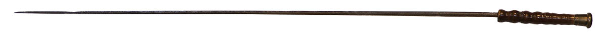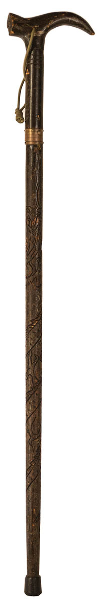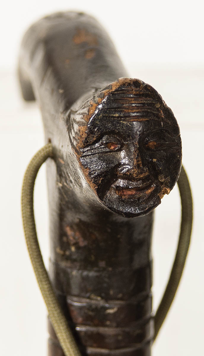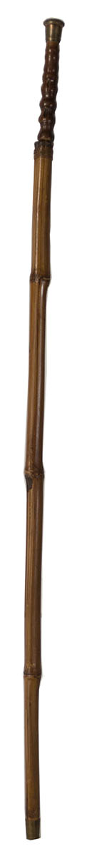 One with face carved into the handle, and a brass button on shaft, producing a sword; and the other a bamboo shaft with interior sword.
