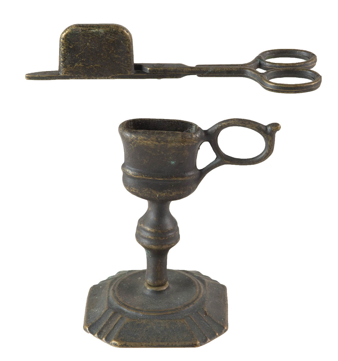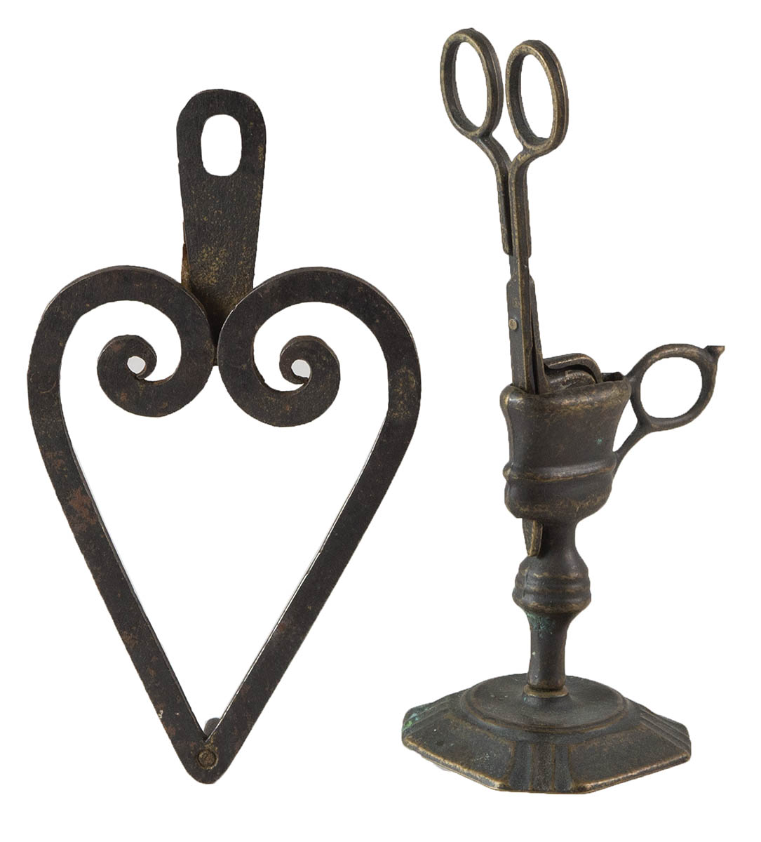 Rare 18th c. brass candle snuffer, excellent condition, in its original petal base holder, 7 1/4″ h; Small hand-wrought iron trivet, heart-shaped and footed, 7 1/4″ l.