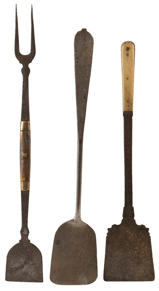 Fine and rare utensils to include a bone handled iron spatula, with delicately scrolled blade, 14″ l; an 18th c. combination fork and spatula, with medial bone handle, 16 1/2″ l; and a forged iron spatula with flattened handle, 15″ l.