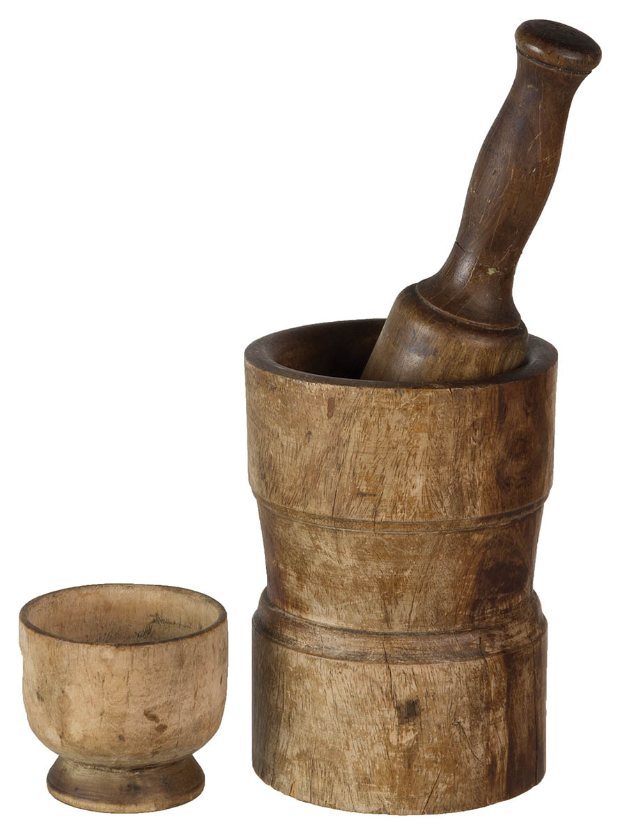 Early treenware, turned maple, footed open salt, 2 3/4″ h; 18th/19th c. Lignum Vitae mortar and pestle, 6 1/4″ h, 9″ h (pestle).