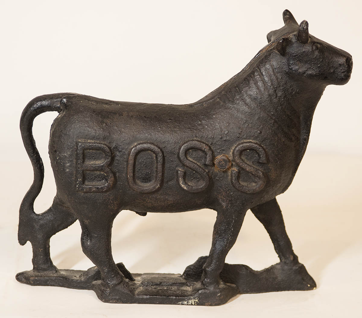 Full bodied cast in two parts, and held with a bolt and nut, “BOSS” raised on both sides, Dempster Manufacturing, Des Moines, Iowa, c. 1880-1920, black painted finish, 12 1/2″ h, 14″ l, 4″ d.