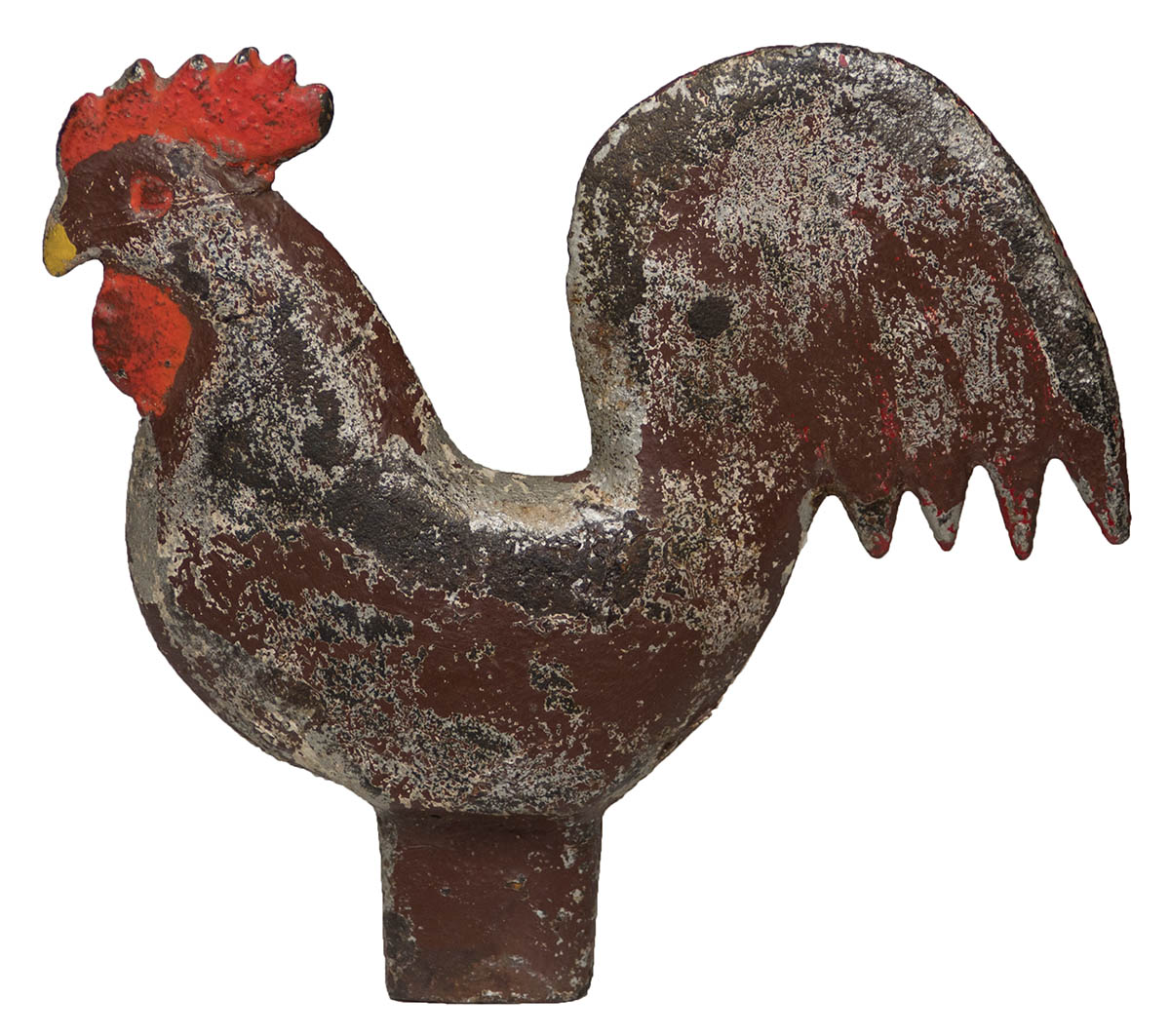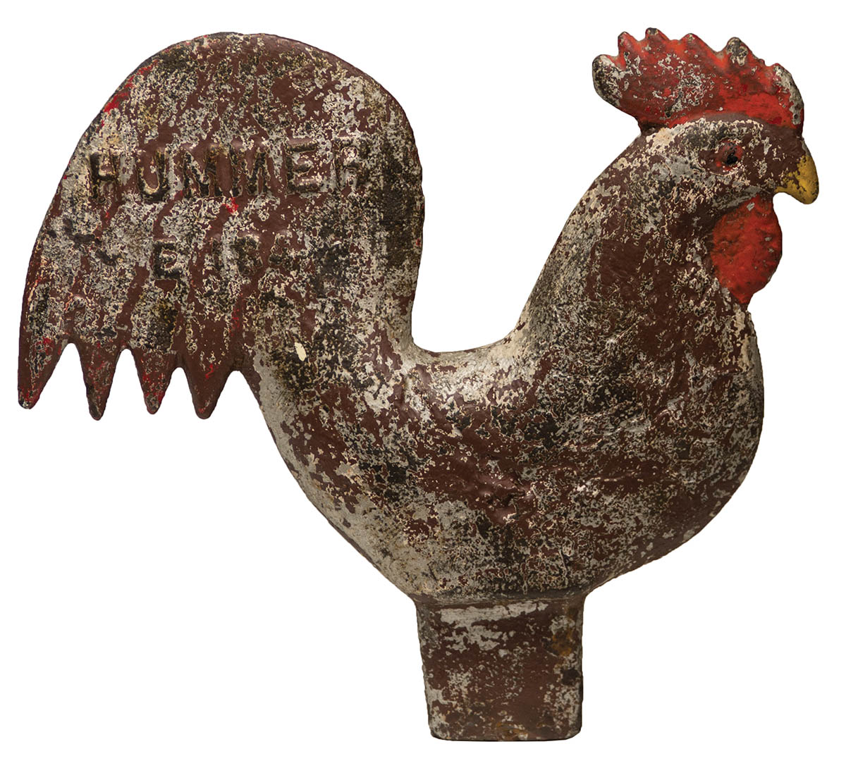 Worn silver and brown painted finish, with red highlights, casting mark “Hummer, E 184″ in raised letters on one side, Elgin Wind Power Co. Manufacturing, four stylized tail feathers and six peaks on comb, 9″ h, 9 1/2” l.