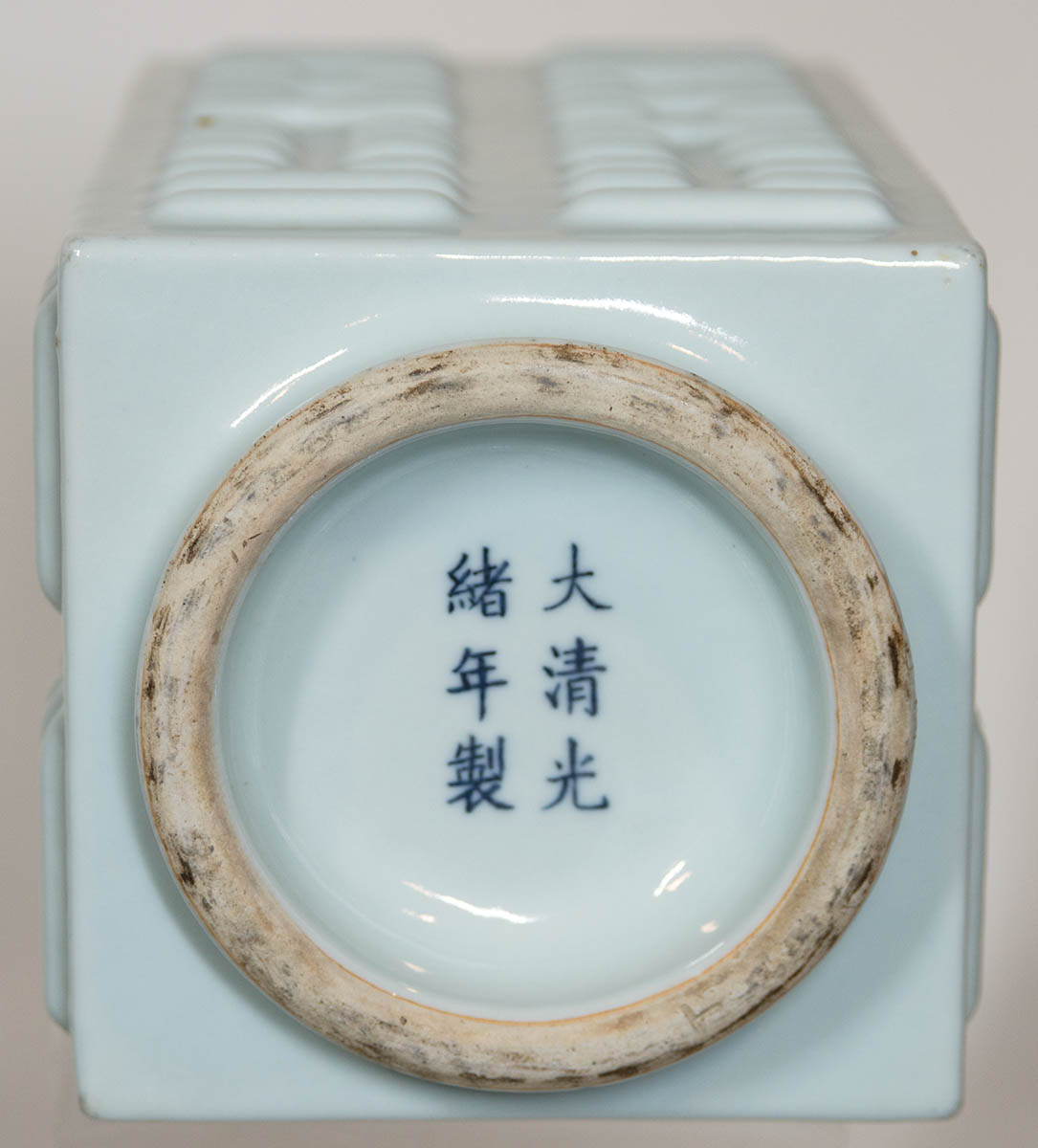 Very fine porcelain K’u vase, rectangular form, tapered cylindrical neck, high relief Trigrams on all sides, (“Great Ching Kuang Shu period made, 1875-1908″ – translation of six character marks on ring base), descended through the Brooks family of Salem, MA, good condition, 11” h. [Note: Brought to Salem, Massachusetts from China by William Franklin Spinney (1853-1929), graduate of Harvard, and Director of Customs for the Chinese Government off and on from 1874-1905.]