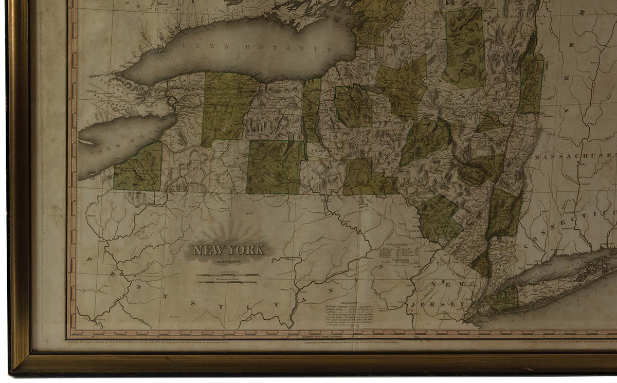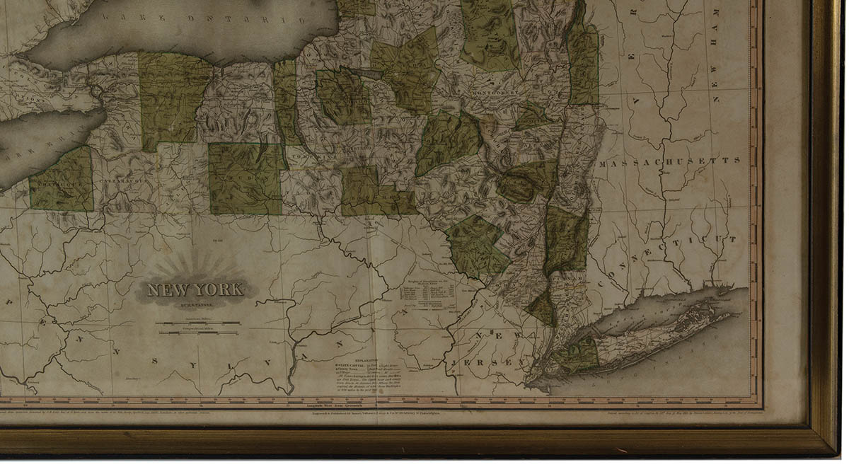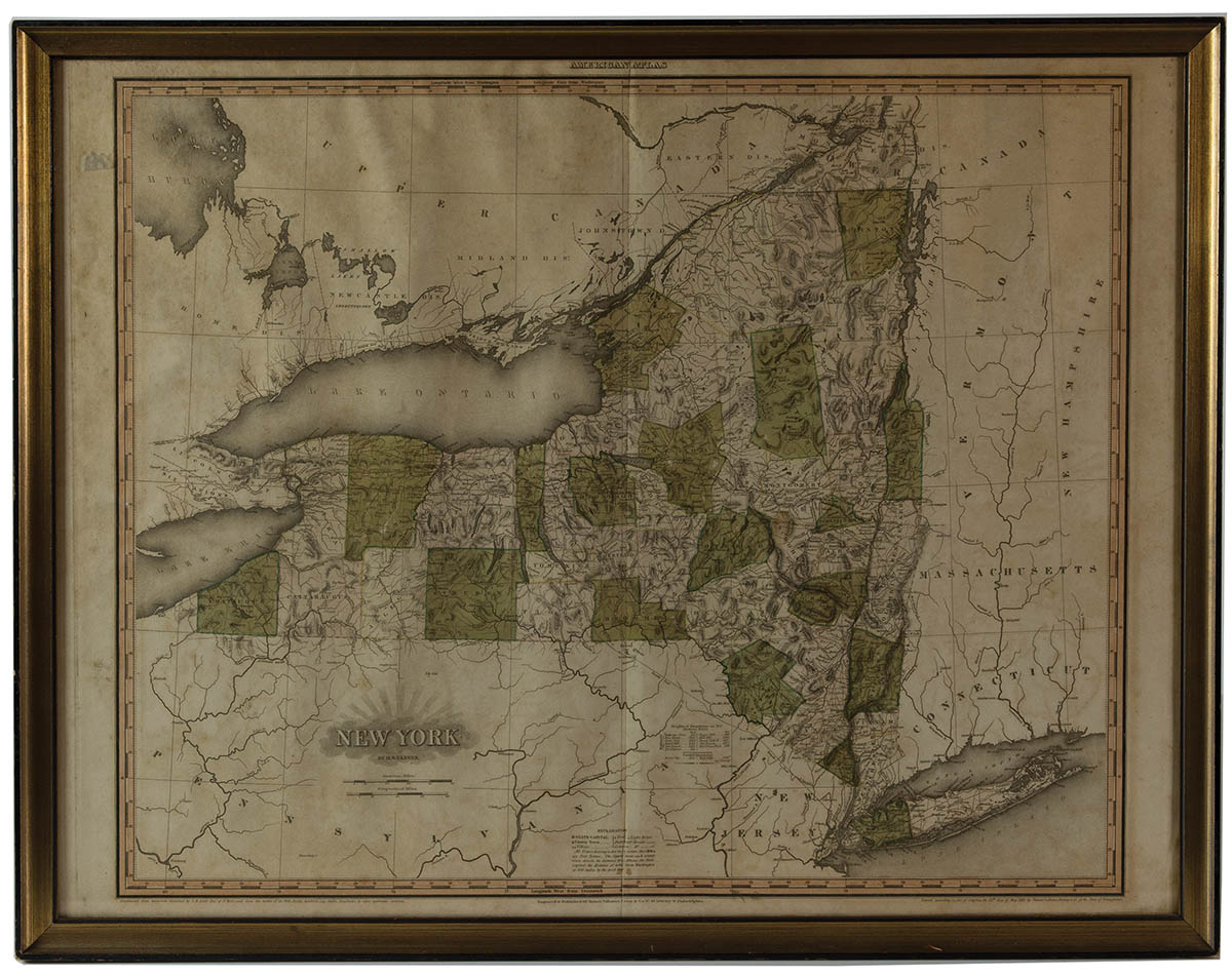 Map by H.S. Tanner, 1819, showing counties in shades of green, engraved by Tanner, Vallance and Kearney, #10 Library St. Philadelphia, from the American Atlas, fold line in center, light staining, toned, overall good, framed and glazed.