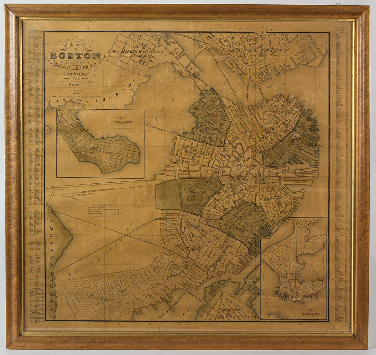 Excellent map of “Boston comprising a part of Charlestown and Cambridge”, published by George C. Smith, Engraver, Boston, 1845, with a listing of streets, Wards are in shades of green, framed and glazed, labeled on reverse “Old Print Shop”, evenly toned, good margins, bird’s-eye frame, 22 1/2″ x 24″ (sight).