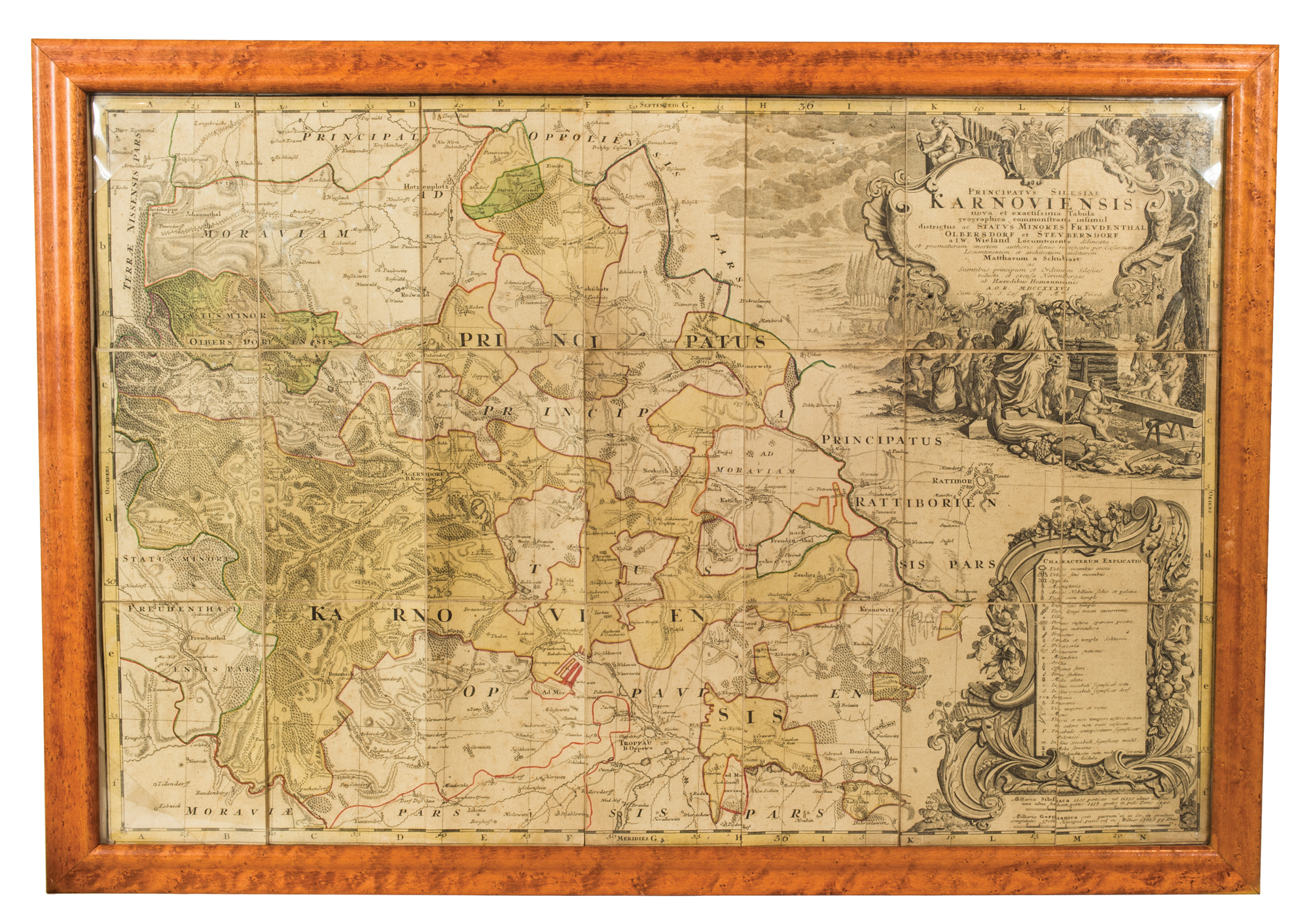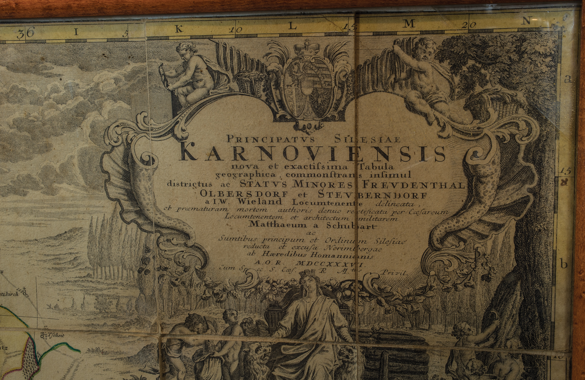 “Karnoviensis”, Poland, Silesia, Moravia, Johann W. Wieland and M. Schubart, 1736, some separation at fold lines, hand colored, large intricate cartouche, bird’s-eye maple frame.