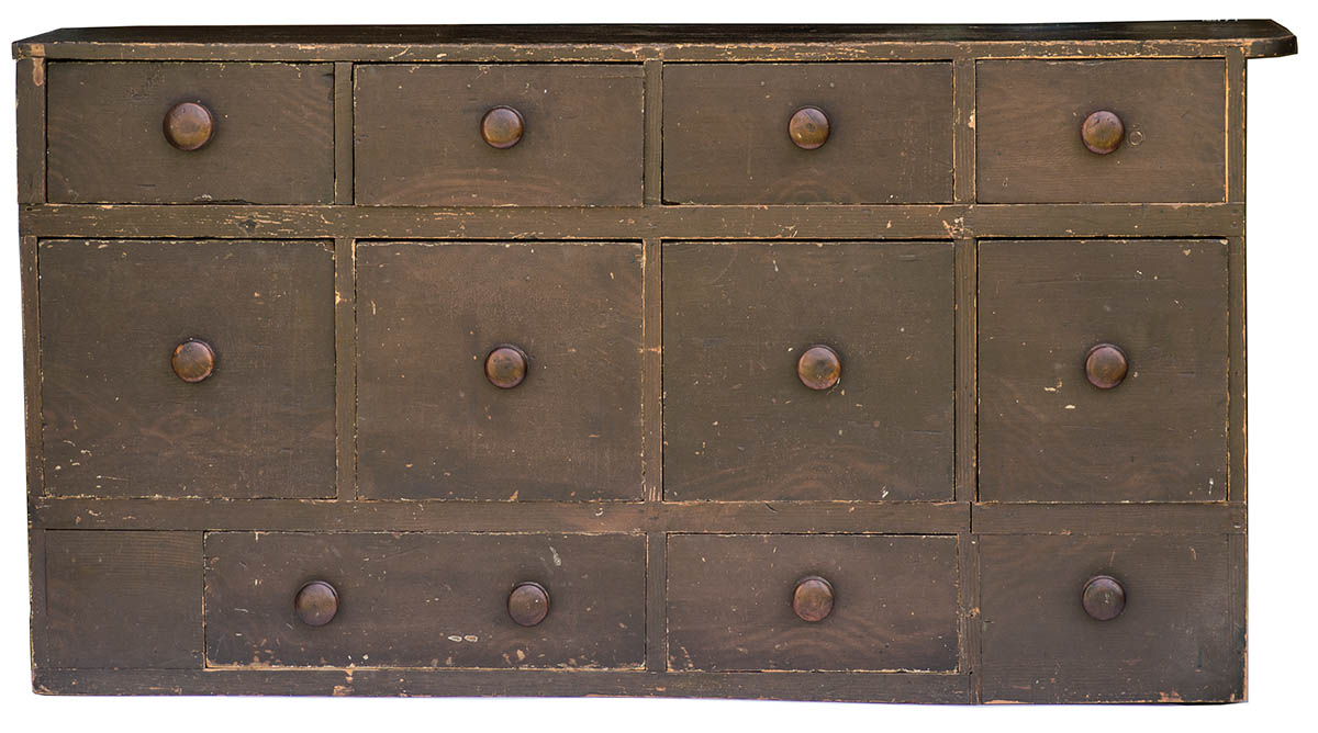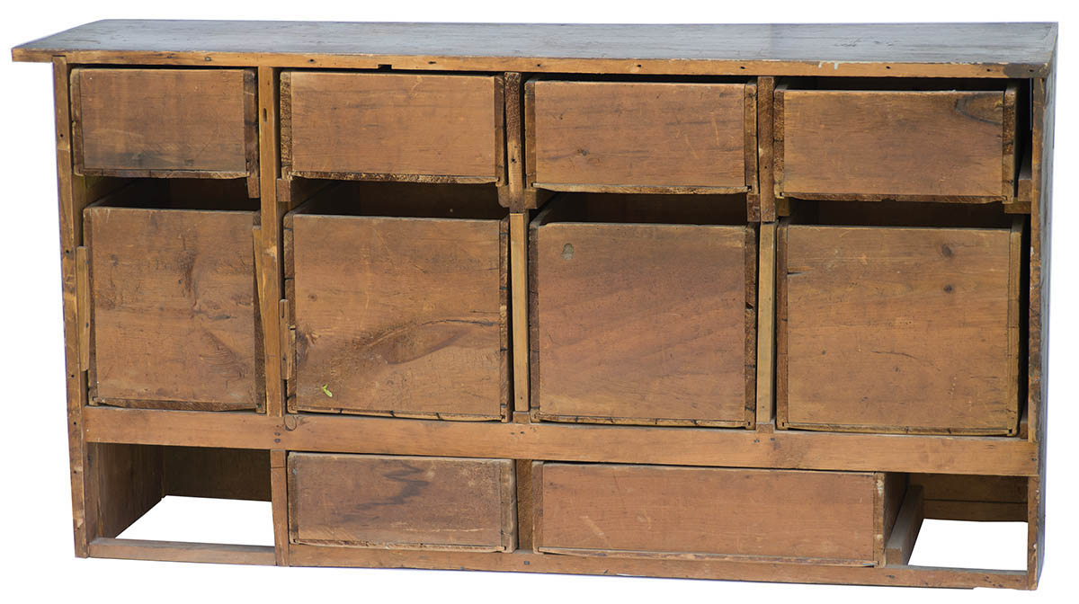 New England, pine, ten drawer apothecary chest, early Spanish brown painted finish, shows some wear to finish on top, 29 3/4″ h, 57 1/2″ l, 16 1/2″ w.