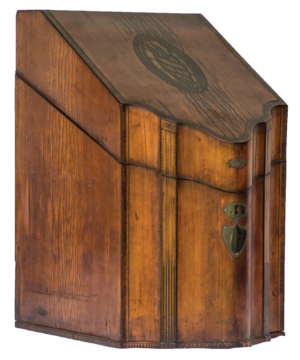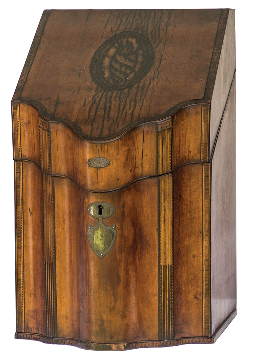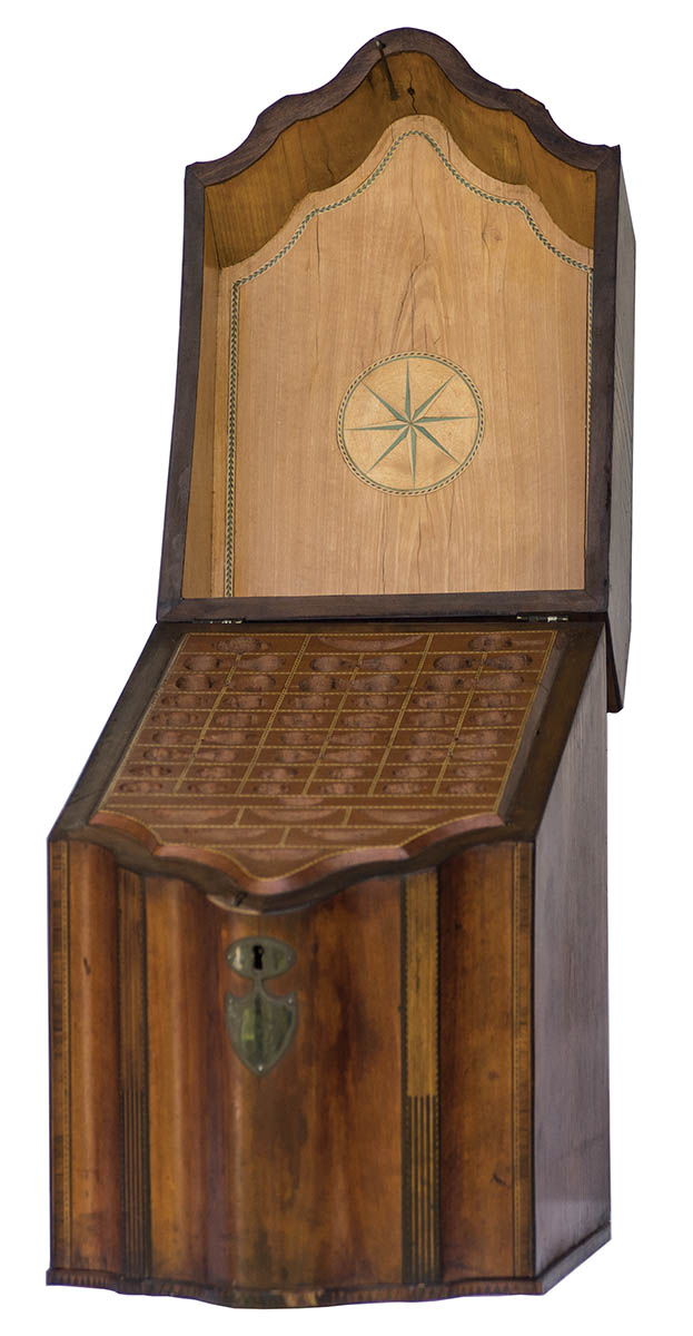 Inlaid top, nautical shell, fitted interior, compass inlaid inside lid, minor missing molding on base, 15 1/2″ h, 9 1/2″ w, 13″ d.