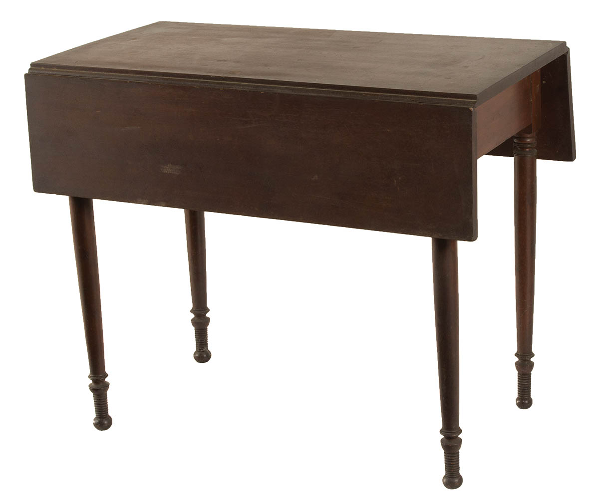 Cherry, Pembroke style, turned and tapered legs, original finish, butterfly leaf supports, 28″ h, 34 1/2″ l, 18″ w (top).