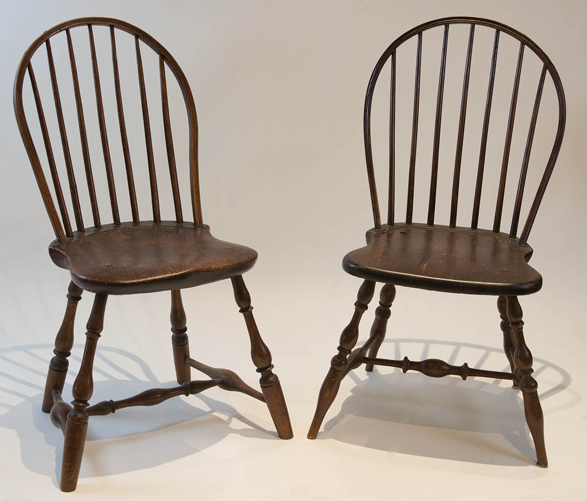 Pair of Windsor side chairs, seven-spindle, pine plank seats, vase and ring finely turned legs, and “H” stretcher, (one Rhode Island, and one Massachusetts).