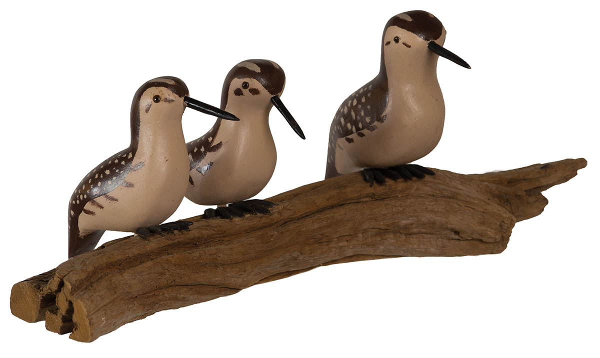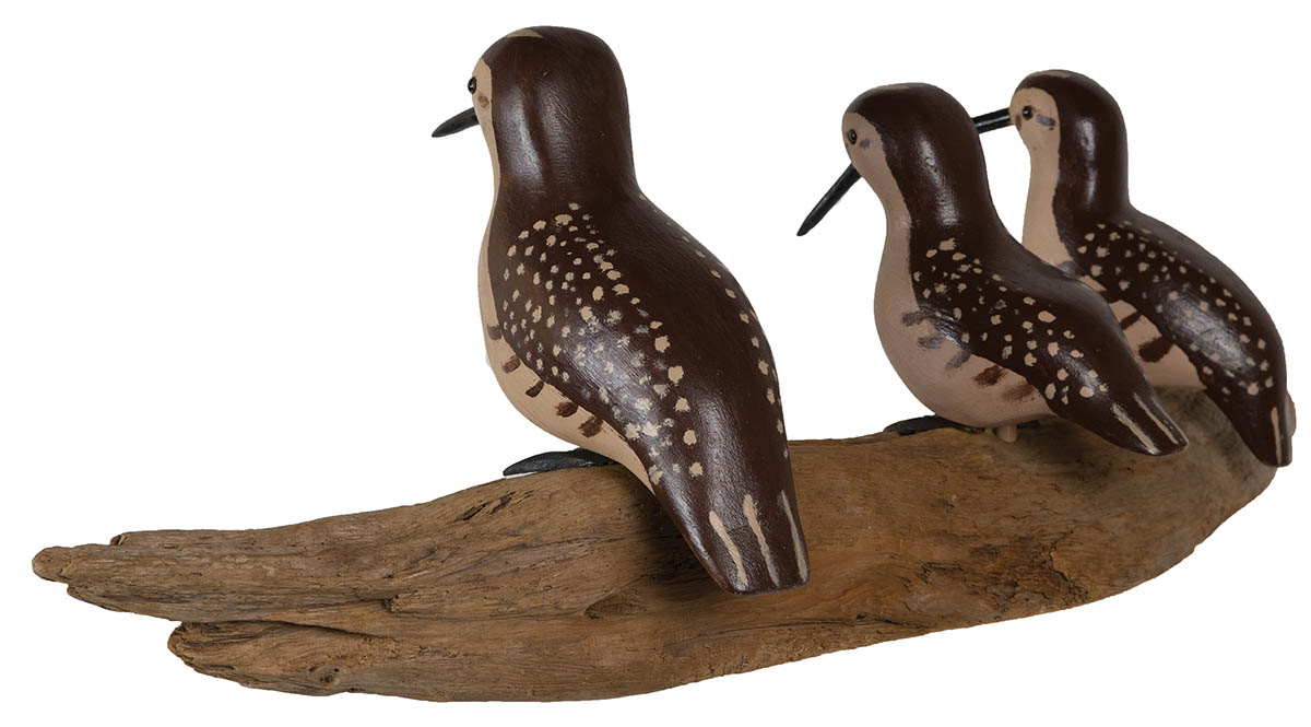 Shore birds mounted on a piece of driftwood, brown and cream paint, with glass eyes, signed “Hardy, 1987”.