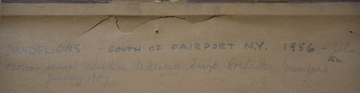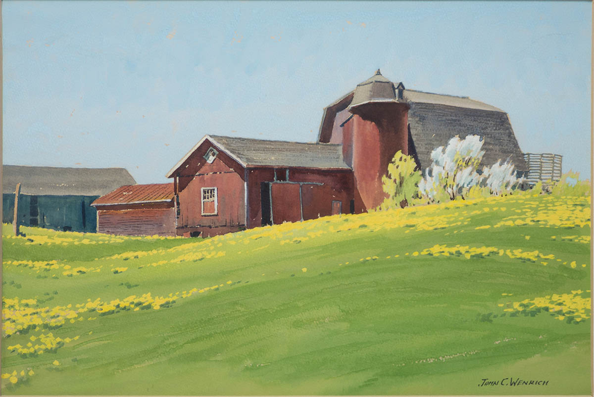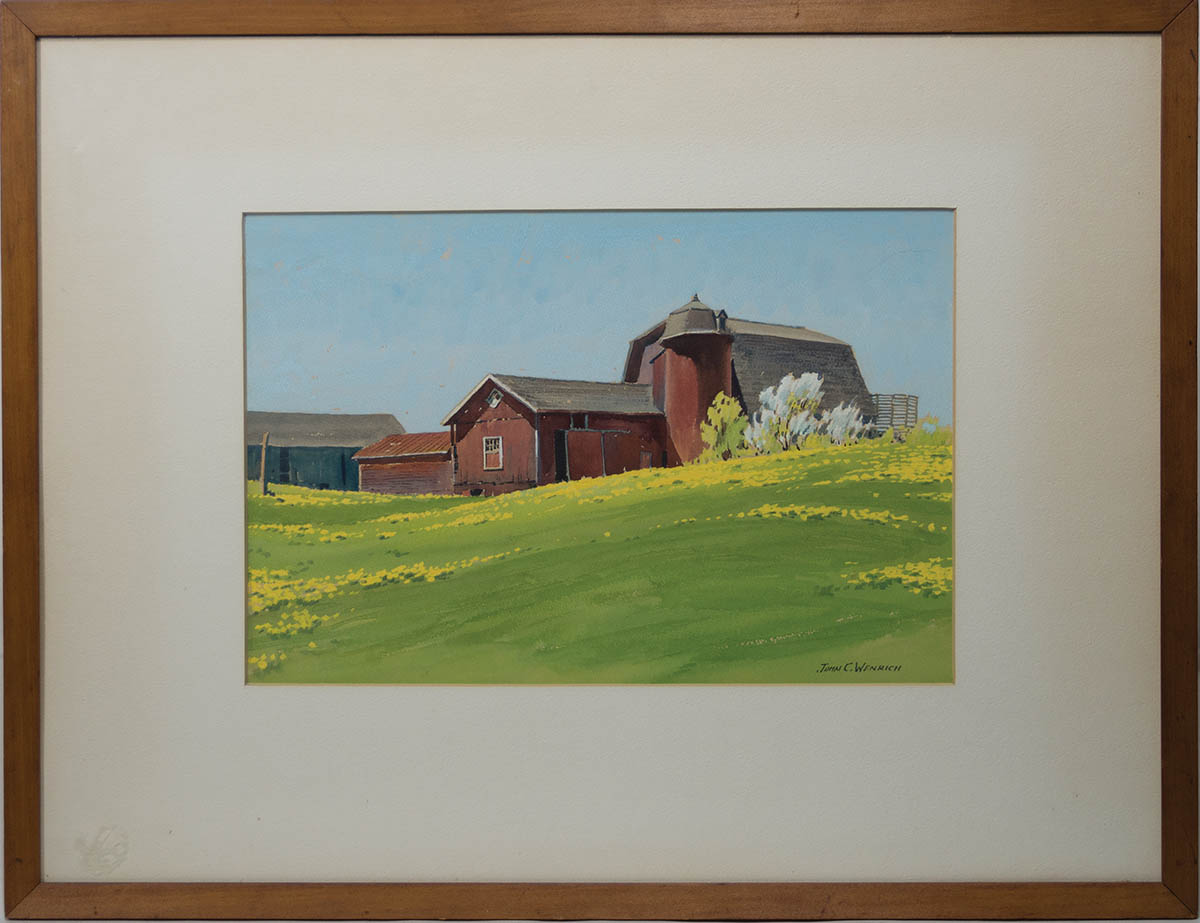Fairport, NY landscape with red barns and yellow flowers, c. 1950, “Annual Exhibition the Geneses Group, Rochester, N.Y. 1957″, matted and framed, 10″ x 14 1/2” (sight), (ex. Lane estate, Hingham, MA).
