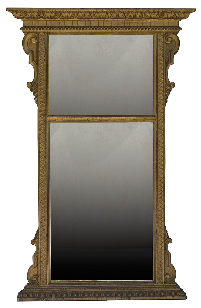 With double mirror, gold painted finish, 35 1/2″ h, 22 1/2″ w, 3″ d.