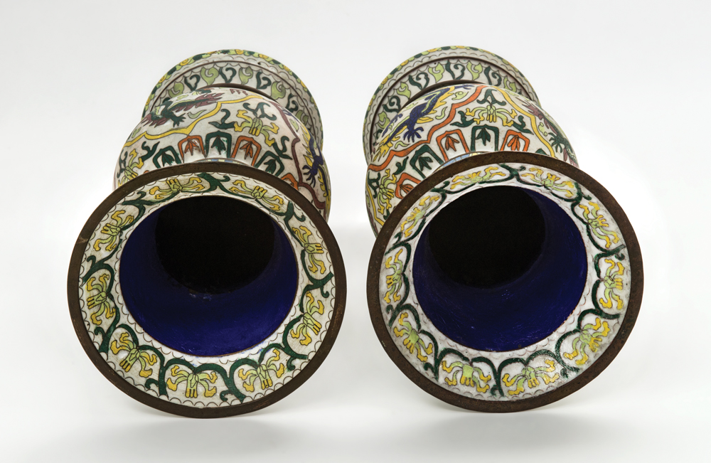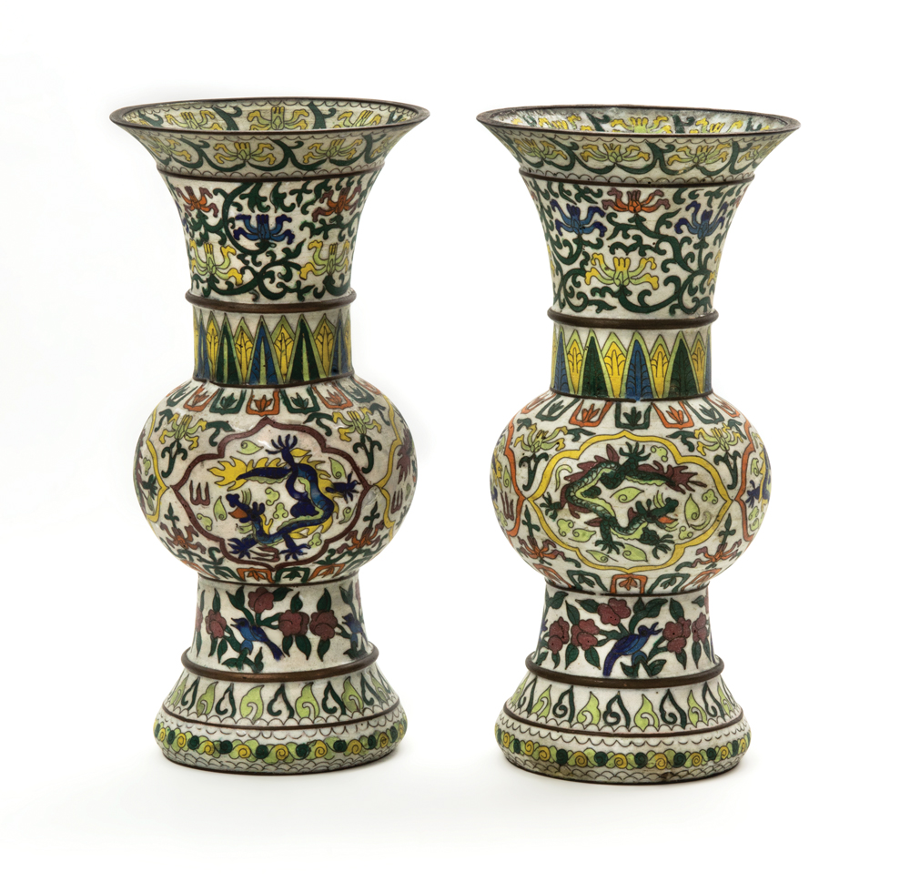 Unusual late 19th c. baluster vases, porcelain on metal, made for the Middle Eastern Market, cloisonne over white bisque porcelain, in the cloisonne technique, 12 1/2″ h.