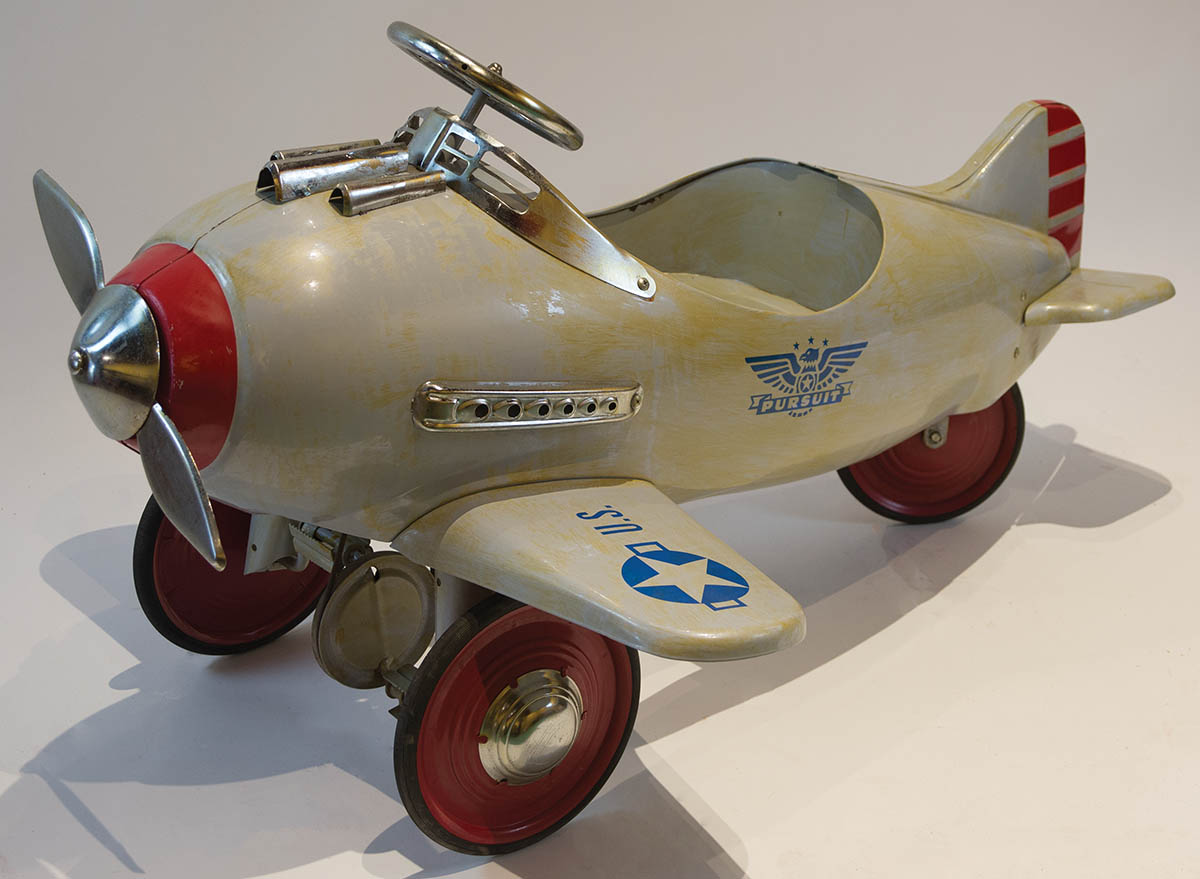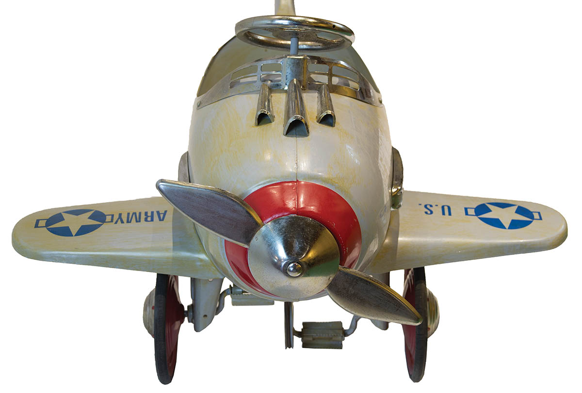 Silver propeller that turns when plane is pedaled, blue and gray decals “U.S. Army”, red wheels with rubber rims, 48″ l, 36″ w.
