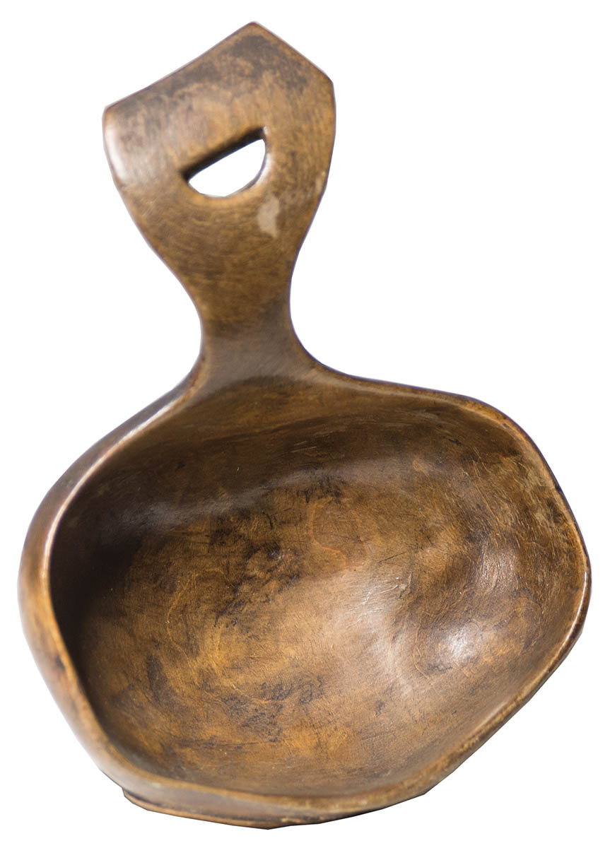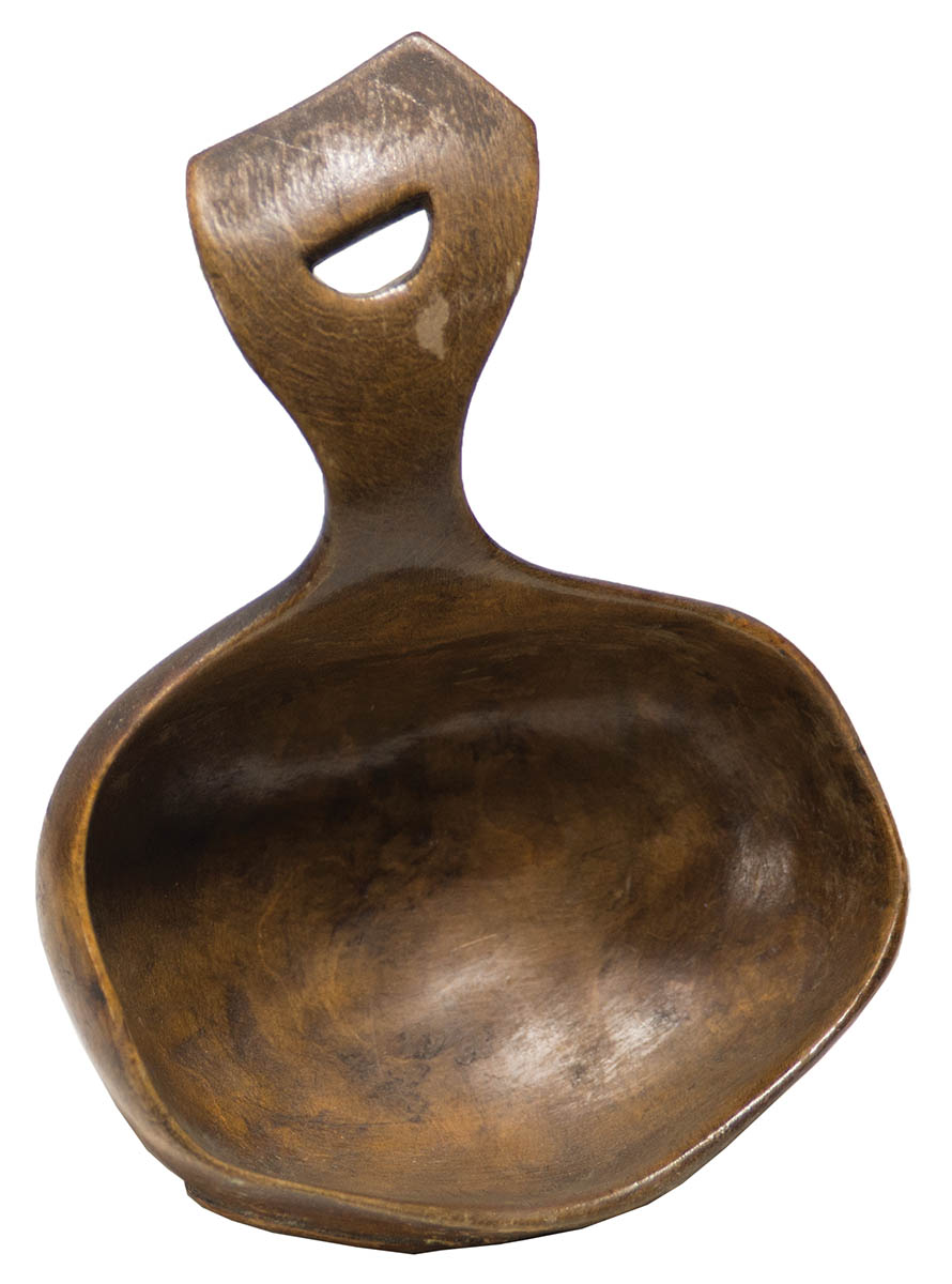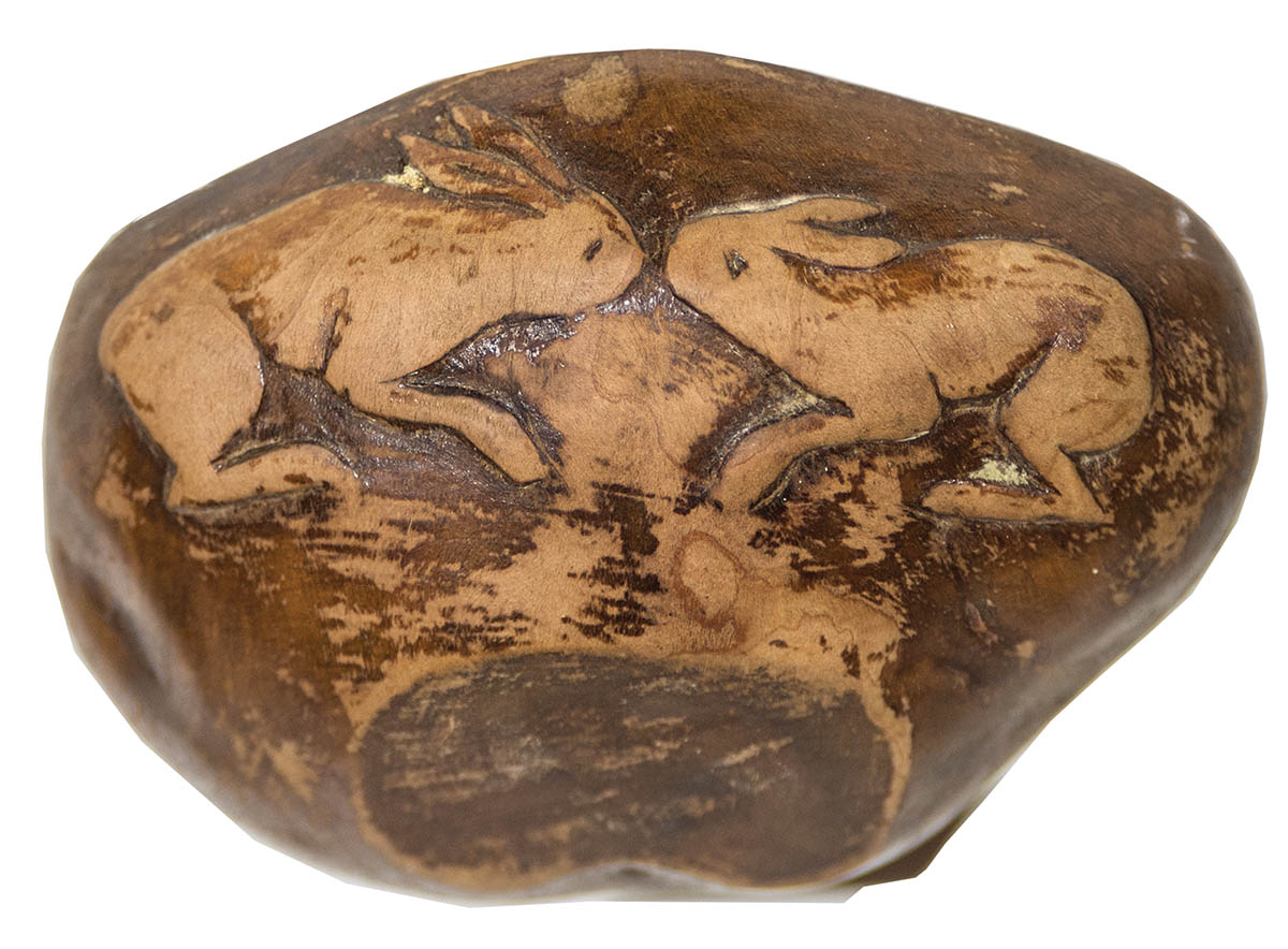 With two rabbits face to face on the cup, found in a Midwest collection, tagged from a collector “Grandma’s favorite Burl scoop with bunny rabbits, and they always faced her at the sink”, 5″ l, 4″ w.